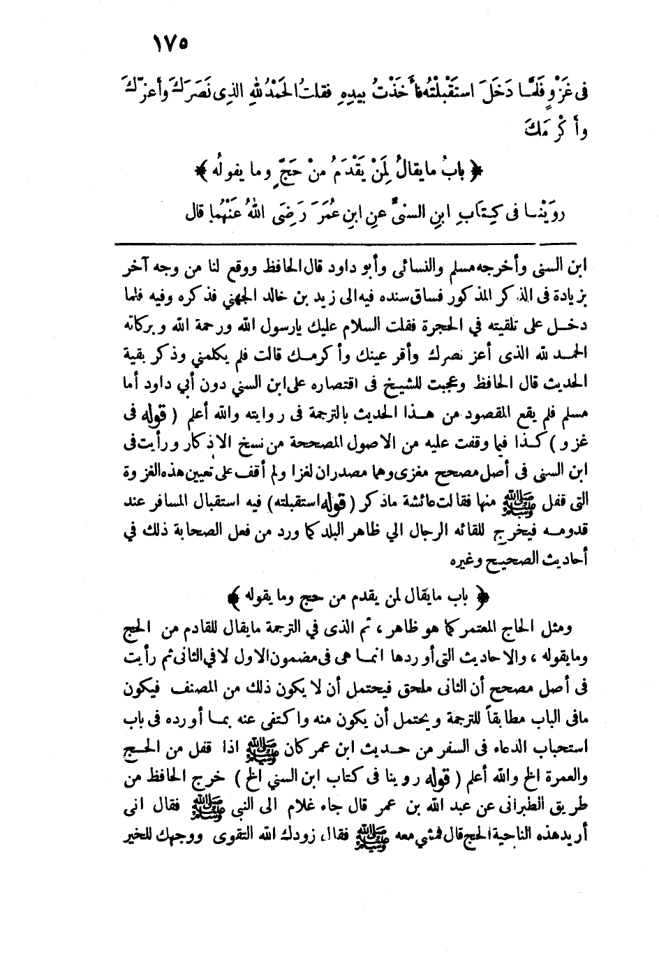 ومثل الحاج المعتمر كما هو ظاهر، ثم الذي في الترجمة ما يقال للقادم من الحج وما يقوله، والأحاديث التي أوردها إنما هي في مضمون الأول لا في الثاني ثم رأيت في أصل مصحح أن الثاني ملحق فيحتمل أن لا يكون ذلك من المصنف فيكون ما في الباب مطابقًا للترجمة ويحتمل أن يكون منه واكتفى عنه بما أورده في باب استحباب الدعاء في السفر من حديث ابن عمر كان - صلى الله عليه وسلم - إذا قفل من الحج والعمرة الخ والله أعلم. قوله: (روينا في كتاب ابن السني الخ) خرج الحافظ من طريق الطبراني