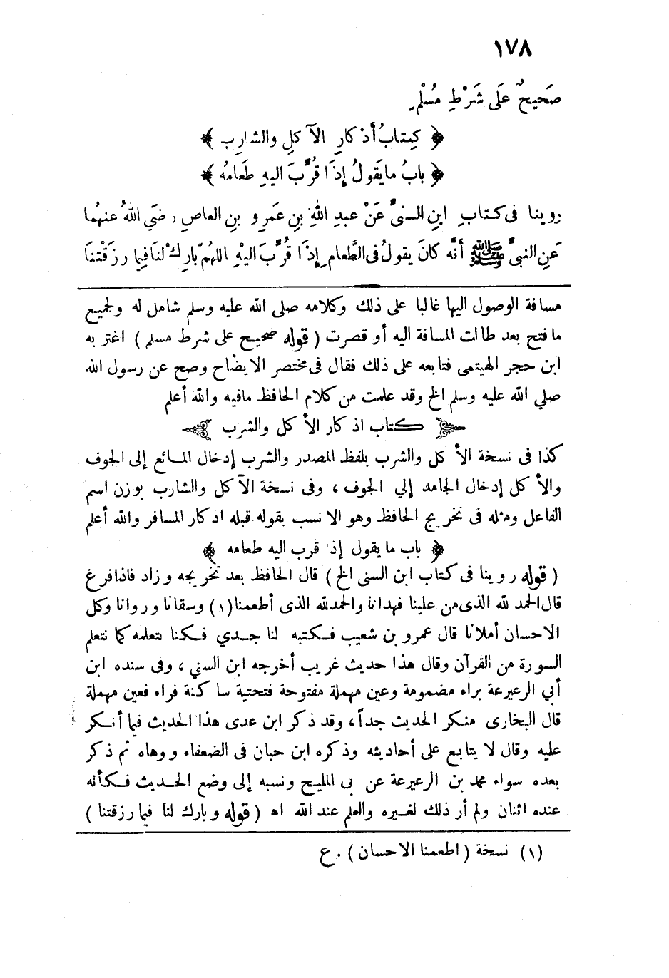 روينا في كتاب ابن السني عن عبد الله بن عمرو بن العاص رضي الله عنهما عن النبي - صلى الله عليه وسلم - أنه كان يقول في الطعام إذ قُرِّب إليه: "اللَهُمَّ بارِكْ لنا فِيما رَزَقْتَنا،