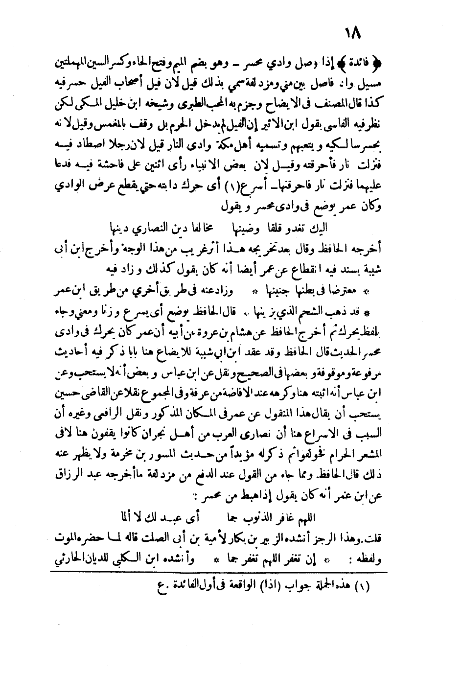 إذا وصل وادي محسر -وهو بضم الميم وفتح الحاء وكسر السين المهملتين مسيل واد فاصل بين منى ومزدلفة سمي بذلك قيل: لأن قيل أصحاب الفيل حسر فيه كذا قال المصنف في الإيضاح وجزم به المحب الطبري وشيخه ابن خليل المكي لكن نظر فيه الفاسي بقول ابن الأثير إن الفيل لم يدخل الحرم بل وقف بالمغمس وقيل لأنه يحسر سالكيه ويتعبهم وتسميه أهل مكة وادي النار قيل: لأن رجل اصطاد فيه فنزلت نار فأحرقته وقيل لأن بعض الأنبياء رأى اثنين على فاحشة فيه فدعا عليهما فنزلت نار فأحرقتها -أسرع أي حرك دابته حتى يقطع عرض الوادي وكان عمر يوضع في وادي محسر ويقول: