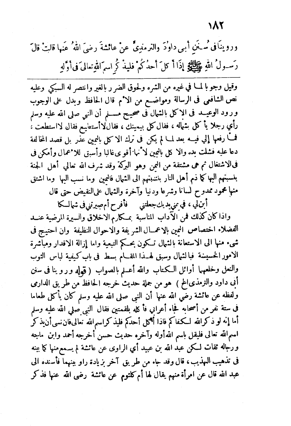 وقيل وجوبًا لما في غيره من الشره ولحوق الضرر بالغير وانتصر له السبكي وعليه نص الشافعي في الرسالة ومواضع من الأم قال الحافظ ويدل على الوجوب ورود الوعيد في الأكل بالشمال في صحيح مسلم أن النبي - صلى الله عليه وسلم - رأى رجلًا يأكل بشماله، فقال: كل بيمينك، فقال: لا أستطيع
