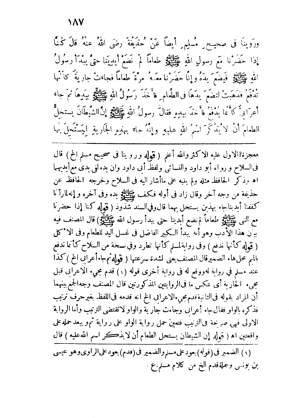 معجزة؟ الأول عليه الأكثر والله أعلم. قوله: (وروينا في صحيح مسلم الخ) قال في السلاح ورواه أبو داود والنسائي ولفظ أبي داود وأن يده لفي يدي مع أيديهما اهـ. وذكر الحافظ مثله ولم ينبه على ما أشار إليه في السلاح وخرجه الحافظ عن حذيفة من وجه آخر وقال: زاد في أوله فكف - صلى الله عليه وسلم - يده وفي آخره وإنه لما رآنا كففنا أيدينا جاء بهذين يستحل بهما قال وفي السند شذوذ. قوله: (كنا إذا حضرنا مع النبي - صلى الله عليه وسلم - طعامًا لم نضع أيدينا حتى يبدأ رسول الله - صلى الله عليه وسلم -) قال المصنف فيه بيان هذا الأدب وهو أنه يبدأ الكبير الفاضل في غسل اليد للطعام وفي الأكل. قوله: (كأنها تدفع) وفي رواية لمسلم كأنها تطرد وفي نسخة من السلاح كأنما تدفع بالميم محل هاء الضمير قال المصنف يعني لشدة سرعتها. قوله: (ثم جاء أعرابي الخ) كذا عند مسلم في رواية له ووقع له في رواية أخرى قوله قدم مجيء الأعرابي قبل مجيء الجارية أي عكس ما في الروايتين المذكورتين قال المصنف وجه الجمع بينهما أن المراد بقوله في الثانية قدم مجيء الأعرابي الخ أنه قدمه في اللفظ بغير حرف ترتيب فذكره بالواو فقال جاء أعرابي وجاءت جارية والواو لا تقتضي الترتيب وأما الرواية الأولى فهي صريحة في الترتيب فتعين حمل رواية الواو على رواية ثم ويبعد حمله على واقعتين اهـ. قوله: (إن الشيطان يستحل الطعام أن لا يذكر اسم الله عليه) قال