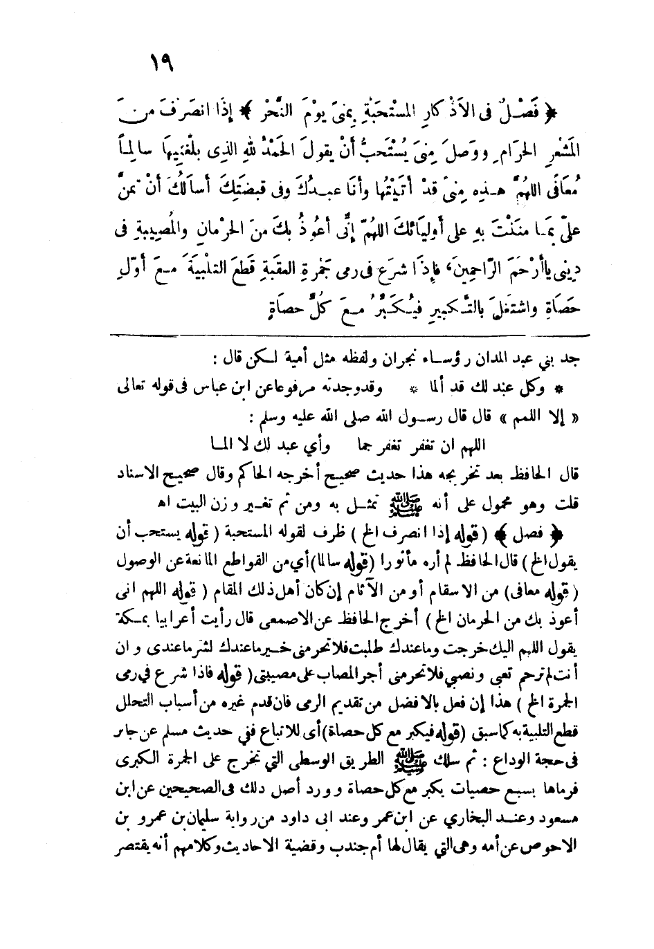قوله: (إذا انصرف الخ) ظرف لقوله المستحبة. قوله: (يستحب أن يقول الخ) قال الحافظ: لم أره مأثورًا. قوله: (سالمًا) أي من القواطع المانعة عن الوصول. قوله: (معافى) من الأسقام أو من الآثام إن كان أهل ذلك المقام. قوله: (اللهم إني أعوذ بك من الحرمان الخ) أخرجه الحافظ عن الأصمعي قال: رأيت أعرابيًّا بمكة يقول: اللهم إليك خرجت وما عندك طلبت فلا تحرمني خير ما عندك لشر ما عندي وإن أنت لم ترحم تعبي ونصبي فلا تحرمني أجر المصاب على مصيبتي. قوله: (فإذا شرع في رمي الجمرة الخ) هذا إن فعل بالأفضل من تقديم الرمي فإن قدم غيره من أسباب التحلل قطع التلبية به كما سبق. قوله: (فيكبر مع كل حصاة) أي للأتباع ففي حديث مسلم عن جابر في حجة الوداع: ثم سلك - صلى الله عليه وسلم - الطريق الوسطى التي تخرج على الجمرة الكبرى فرماها بسبع حصيات يكبر مع كل حصاة وورد أصل ذلك في الصحيحين عن ابن مسعود وعند البخاري عن ابن عمر وعند أبي داود من رواية سليمان بن عمرو بن الأحوص عن أمه وهي التي يقال لها: أم جندب وقضية الأحاديث وكلامهم أنه يقتصر