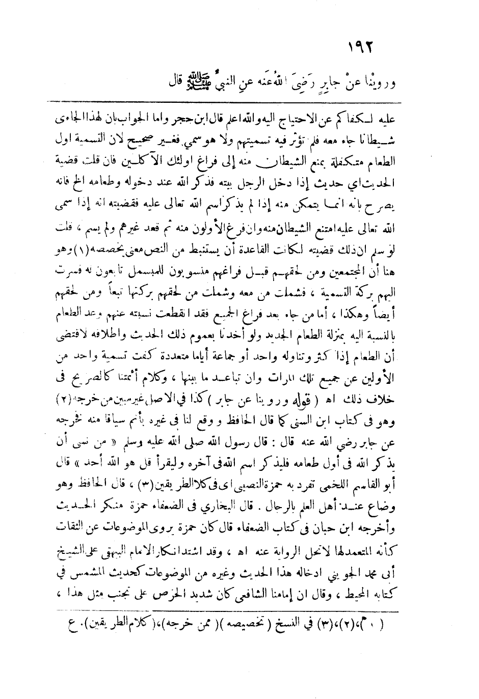 عليه لكفاكم عن الاحتياج إليه والله أعلم قال ابن حجر وأما الجواب بأن لهذا الجائي شيطانًا جاء معه فلم تؤثر فيه تسميتهم ولا هو سمى فغير صحيح لأن التسمية أول الطعام متكفلة بمنع الشيطان منه إلى فراغ أولئك الآكلين فإن قلت قضية الحديث أي حديث إذا دخل الرجل بيته فذكر الله عند دخوله وطعامه الخ فإنه يصرح بأنه إنما يتمكن منه إذا لم يذكر اسم الله تعالى فقضيته أنه إذا سمى الله تعالى عليه امتنع الشيطان منه وإن فرغ الأولون منه ثم قعد غيرهم ولم يسم، قلت: لو سلم أن ذلك قضيته لكانت القاعدة أن يستنبط من النص معنى يخصصه وهو هنا أن المجتمعين ومن لحقهم قبل فراغهم منسوبون للمبسمل تابعون له فسرت إليهم بركة التسمية، فشملت من معه وشملت من لحقهم بركتها تبعًا ومن لحقهم أيضًا وهكذا، أما من جاء بعد فراغ الجميع فقد انقطعت نسبته عنهم وعد الطعام بالنسبة إليه بمنزلة الطعام الجديد ولو أخذنا بعموم ذلك الحديث وإطلاقه لاقتضى أن الطعام إذا كثر وتناوله واحد أو جماعة أيامًا متعددة كفت تسمية واحد من الأولين عن جميع تلك المرات وإن تباعد ما بينها، وكلام أئمتنا كالصريح في خلاف ذلك اهـ. قوله: (وروينا عن جابر) كذا في الأصل غير مبين من خرجه وهو في كتاب ابن السني كما قال الحافظ ووقع لنا في غيره بأتم سياق منه فخرجه عن جابر رضي الله عنه قال: قال رسول الله - صلى الله عليه وسلم -: "من نسي أن يذكر الله في أول طعامه فليذكر اسم الله في آخره وليقرأ قل هو الله أحد" قال أبو القاسم اللخمي تفرد به حمزة النصيبي أي في كلا الطريقين، قال الحافظ وهو وضاع عند أهل العلم بالرجال. قال البخاري في الضعفاء حمزة منكر الحديث وأخرجه ابن حبان في كتاب الضعفاء قال: كان حمزة يروي الموضوعات عن الثقات كأنه المتعمد لها لا تحل الرواية عنه اهـ، وقد اشتد إنكار الإِمام البيهقي على الشيخ أبي محمد الجويني إدخاله هذا الحديث وغيره من الموضوعات كحديث المشمس في كتابه المحيط، وقال إن إمامنا الشافعي كان شديد الحرص على تجنب مثل هذا،