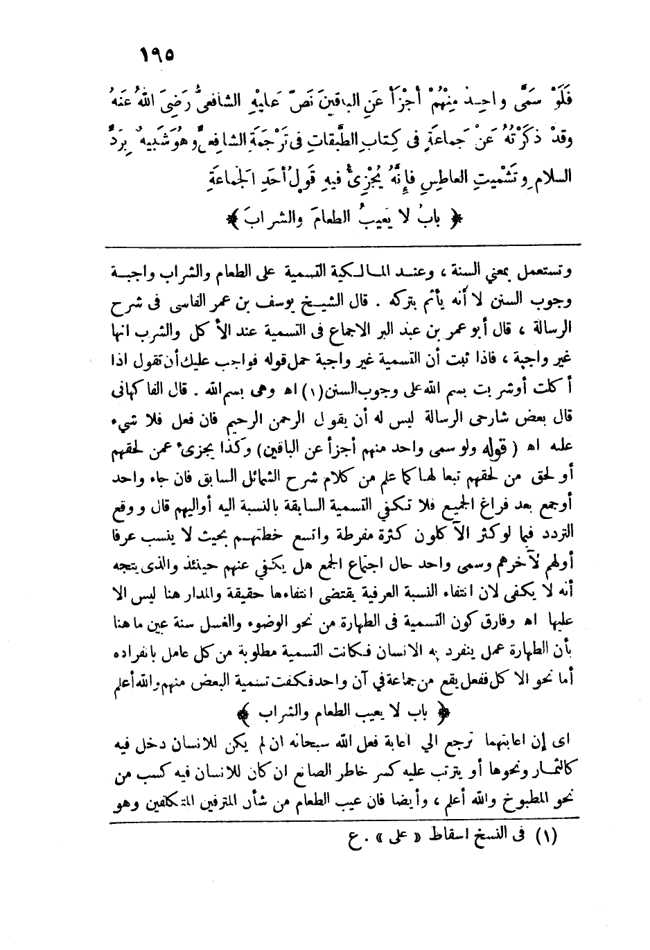وتستعمل بمعنى السنة، وعند المالكية التسمية على الطعام والشراب واجبة وجوب السنن لا أنه يأثم بتركه. قال الشيخ يوسف بن عمر الفاسي في شرح الرسالة، قال أبو عمر بن عبد البر: الإجماع في التسمية عند الأكل والشرب أنها غير واجبة، فإذا ثبت أن التسمية غير واجبة حمل قوله فواجب عليك أن تقول إذا أكلت أو شربت بسم الله على وجوب السنن اهـ وهي بسم الله. قال الفاكهاني: قال بعض شارحي الرسالة: ليس له أن يقول