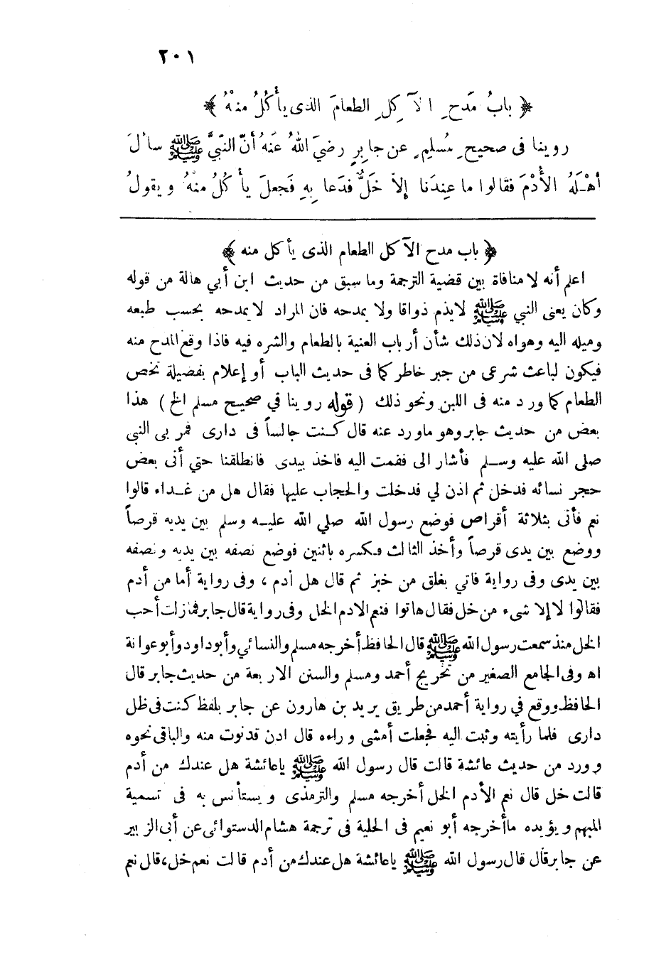 اعلم أنه لا منافاة بين قضية الترجمة وما سبق من حديث ابن أبي هالة من قوله وكان يعني النبي - صلى الله عليه وسلم - لا يذم ذواقًا ولا يمدحه فإن المراد لا يمدحه بحسب طبعه وميله إليه وهواه لأن ذلك شأن أرباب العنية بالطعام والشره فيه فإذا وقع المدح منه فيكون لباعث شرعي من جبر خاطر كما في حديث الباب أو إعلام بفضيلة تخص الطعام كما ورد منه في اللبن ونحو ذلك. قوله: (روينا في صحيح مسلم الخ) هذا بعض من حديث جابر وهو ما ورد عنه قال: كنت جالسًا في داري فمر بي النبي - صلى الله عليه وسلم - فأشار إلي فقمت إليه فأخذ بيدي فانطلقنا حتى أتى بعض حجر نسائه فدخل ثم أذن لي فدخلت والحجاب عليها فقال: هل من غداء قالوا: نعم، فأتى بثلاثة أقراص فوضع رسول الله - صلى الله عليه وسلم - بين يديه