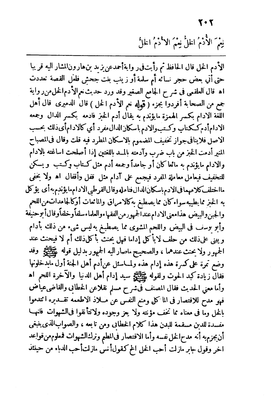 لأدم الخل" قال الحافظ: ثم رأيت في رواية أحمد عن يزيد بن هارون المشار إليه قريبًا حتى أتى بعض حجر نسائه أم سلمة أو زينب بنت جحش فلعل القصة تعددت اهـ. قال العلقمي في شرح الجامع الصغير وقد رد حديث نعم الأدم الخل من رواية جمع من الصحابة أفردوا بجزء. قوله: (نعم الأدم الخل) قال الدميري قال أهل اللغة الإدام بكسر الهمزة ما يؤتدم به يقال: أدم الخبز فأدمه بكسر الدال وجمعه الأدام أدم ككتاب وكتب والأدم بإسكان الدال مفرد أي كالإدام أي ذلك بحسب الأصل فلا ينافي جواز تخفيف المضموم بالإسكان المطرد فيه قلت وقال في المصباح المنير: أدمت الخبز من باب ضرب وآدمته بالمد باللغتين إذا أصلحت أساغته بالإدام والإدام ما يؤتدم به مائعا كان أو جامدًا وجمعه أدم مثل كتاب وكتب ويسكن للتخفيف فيعامل معاملة المفرد فيجمع على آدم مثل قفل وأقفال اهـ. ولا يخفى ما اختلف كلامهما في الأدم بإسكان الدال فتأمله وقال القرطبي: الإدام ما يؤتدم به أي يؤكل به الخبز مما يطيبه سواء كان مما يصطبغ به كالأمراق والمائعات أو كالجامدات من اللحم والجبن والبيض هذا معنى الإدام عند الجمهور من الفقهاء والعلماء سلفًا وخلفًا وقال أبو حنيفة وأبو يوسف في البيض واللحم المشوي مما يصطبغ به ليس شيء من ذلك بأدام ويبني على ذلك من حلف لا يأكل إدامًا فهل يحنث بأكل ذلك أم لا فيحنث عند الجمهور ولا يحنث عندهما، والصحيح ما صار إليه الجمهور بدليل قوله - صلى الله عليه وسلم - وقد وضع تمرة على كسرة هذه إدام هذه ولما سئل عن أدم أهل الجنة أول ما يدخلونها فقال زيادة كبد الحوت ولقوله - صلى الله عليه وسلم - سيد إدام أهل الدنيا والآخرة اللحم اهـ. وأما معنى الحديث فقال المصنف في شرح مسلم نقلًا عن الخطابي والقاضي عياض فهو مدح للاقتصار في المأكل ومنع النفس عن ملاذ الأطعمة تقديره ائتدموا بالخل وما في معناه مما تخف مؤنته ولا يعز وجوده ولا تتأنقوا في الشهوات فإنها مفسدة للدين مسقمة للبدن هذا كلام الخطابي ومن تابعه، والصواب الذي ينبغي أن يجزم به أنه مدح الخل نفسه وأما الاقتصار في المطعم وترك الشهوات فمعلوم من قواعد أخر وقول جابر ما زلت أحب الخل الخ كقول أنس ما زلت أحب الدباء من حينئذٍ