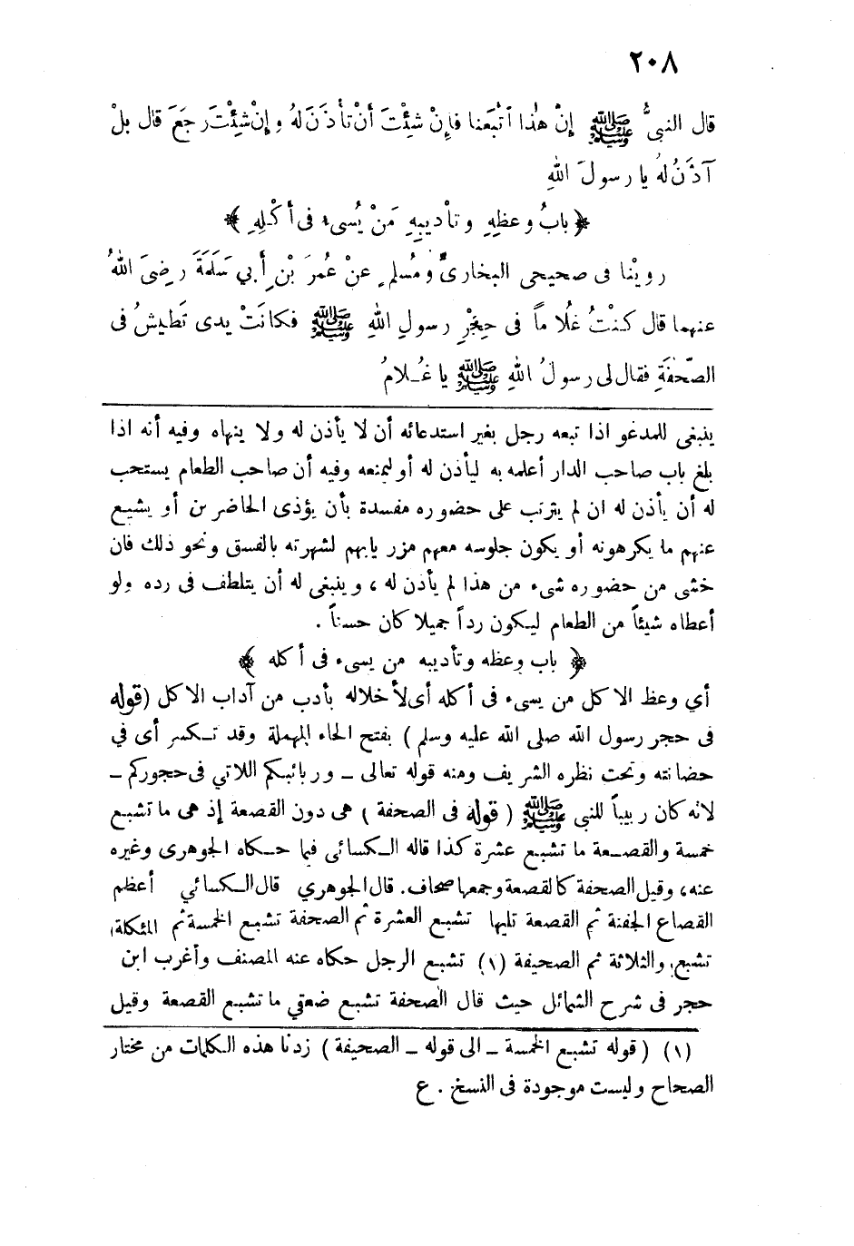 أي وعظ الأكل من يسيء في أكله أي لإخلاله بأدب من آداب الاكل. قوله: (في حجر رسول الله صلى الله عليه وسلم) بفتح الحاء المهملة وقد تكسر أي في حضانته وتحت نظره الشريف ومنه قوله تعالى: {وَرَبَائِبُكُمُ اللَّاتِي فِي حُجُورِكُمْ} لأنه كان ربيبًا للنبي - صلى الله عليه وسلم -.قوله: (في الصحفة) هي دون القصعة إذ هي ما تشبع خمسة والقصعة ما تشبع عشرة كذا قاله الكسائي فيما حكاه الجوهري وغيره عنه، وقيل الصحفة كالقصعة وجمعها صحاف. قال الجوهري قال الكسائي أعظم القصاع الجفنة ثم القصعة تليها تشبع العشرة ثم الصحفة تشبع الخمسة ثم المئكلة تشبع والثلاثة ثم الصحيفة تشبع الرجل حكاه عنه المصنف وأغرب ابن حجر في شرح الشمائل حيث قال الصحفة تشبع ضعفي ما تشبع القصعة وقيل: