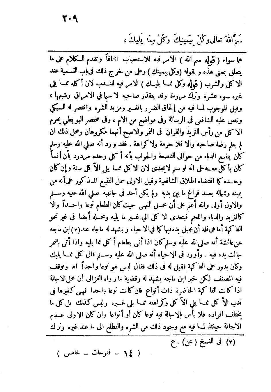 هما سواء. قوله: (سمِّ الله) الأمر فيه للاستحباب اتفاقًا وتقدم الكلام على ما يتعلق بمعنى هذه وبقوله (وكل بيمينك) وقوله من خرج ذلك في باب التسمية عند الأكل والشرب. قوله: (وكل ما يليك) الأمر فيه للندب لأن أكله مما يلي غيره سوء عشرة وترك مروءة وقد يتقذر صاحبه لا سيما في الإمراق وشبهها، وقيل للوجوب لما فيه من إلحاق الضرر بالغير ومزيد الشره وانتصر له السبكي ونص عليه الشافعي في الرسالة وفي مواضع من الأم، وفي مختصر البويطي يحرم الأكل من رأس الثريد والقران في التمر والأصح أنهما مكروهان ومحل ذلك إن لم يعلم رضا صاحبه وإلا فلا حرمة ولا كراهة. فقد ورد أنه - صلى الله عليه وسلم - كان يتتبع الدباء من حوالي القصعة والجواب بأنه أكل وحده مردود بأن أنسًا كان يأكل معه على أنه لو سلم لا يجدي لأن الأكل مما يلي الآكل سنة وإن كان وحده كما اقتضاه إطلاق الشافعية وقيل الأولى حمل التتبع المذكور على أنه من يمينه وشماله بعد فراغ ما بين يديه ولم يكن أحد في جانبيه - صلى الله عليه وسلم - والأول أولى والله أعلم على أن محل النهي حيث كان الطعام نوعًا واحدًا وإلا كالثريد والدباء واللحم فيتعدى الآكل إلى غير ما يليه ومحله أيضًا في غير نحو الفاكهة أما هي فله أن يجيل يده فيها كما في الأحياء ويشهد له ما جاء عند ابن ماجة عن عائشة أنه - صلى الله عليه وسلم - إذا أتى بطعام أكل مما يليه وإذا أتى بالتمر جالت يده فيه. وأورد في الأحياء أنه - صلى الله عليه وسلم - قال: كل مما يليك وكان يدور على الفاكهة فقيل له في ذلك فقال: ليس هو نوعًا واحدًا اهـ. وتوقف فيه المصنف لكن خبر ابن ماجه يشهد له وقضية ما رواه الغزالي أن محل الإجالة إذا كانت الفاكهة الحاضرة ذات أنواع فإن كانت نوعًا