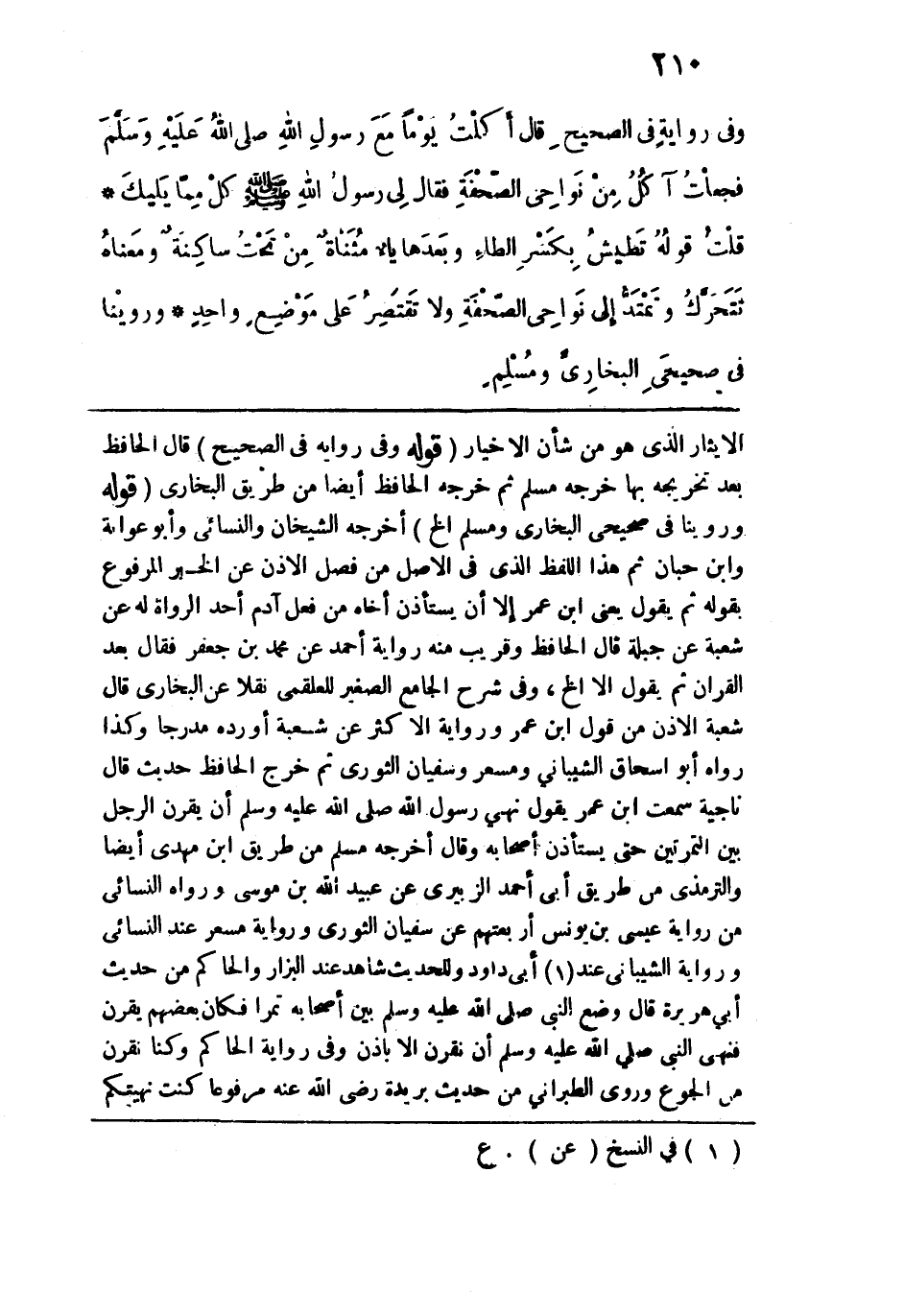 الإيثار الذي هو من شأن الأخيار. قوله: (وفي رواية في الصحيح) قال الحافظ بعد تخريجه بها: خرجه مسلم ثم خرجه الحافظ أيضًا من طريق البخاري. قوله: (وروينا في صحيحي البخاري ومسلم الخ) أخرجه الشيخان والنسائي وأبو عوانة وابن حبان ثم هذا اللفظ الذي في الأصل من فصل الإذن عن الخبر المرفوع بقوله ثم يقول يعني ابن عمر إلا أن يستأذن أخاه من فعل آدم أحد الرواة له عن شعبة عن جبلة قال الحافظ: وقريب منه رواية أحمد عن محمد بن جعفر فقال بعد القران ثم يقول: إلا الخ، وفي شرح الجامع الصغير للعلقمي نقلًا عن البخاري قال شعبة: الإذن من قول ابن عمر ورواية الأكثر عن شعبة أورده مدرجًا وكذا رواه أبو إسحاق الشيباني ومسعر وسفيان الثوري ثم خرج الحافظ حديث قال ناجية: سمعت ابن عمر يقول: نهى رسول الله - صلى الله عليه وسلم - أن يقرن الرجل بين التمرتين حتى يستأذن أصحابه وقال: أخرجه مسلم من طريق ابن مهدي أيضًا والترمذي من طريق أبي أحمد الزبيري عن عبيد الله بن موسى ورواه النسائي من رواية عيسى بن يونس أربعتهم عن سفيان الثوري ورواية مسعر عند النسائي ورواية الشيباني عند أبي داود وللحديث شاهد عند البزار والحاكم من حديث أبي هريرة قال: وضع النبي - صلى الله عليه وسلم - بين أصحابه تمرًا فكان بعضهم يقرن فنهى النبي - صلى الله عليه وسلم - أن نقرن إلا بإذن وفي رواية الحاكم وكنا نقرن من الجوع وروى الطبراني من حديث بريدة رضي الله عنه مرفوعًا كنت نهيتكم