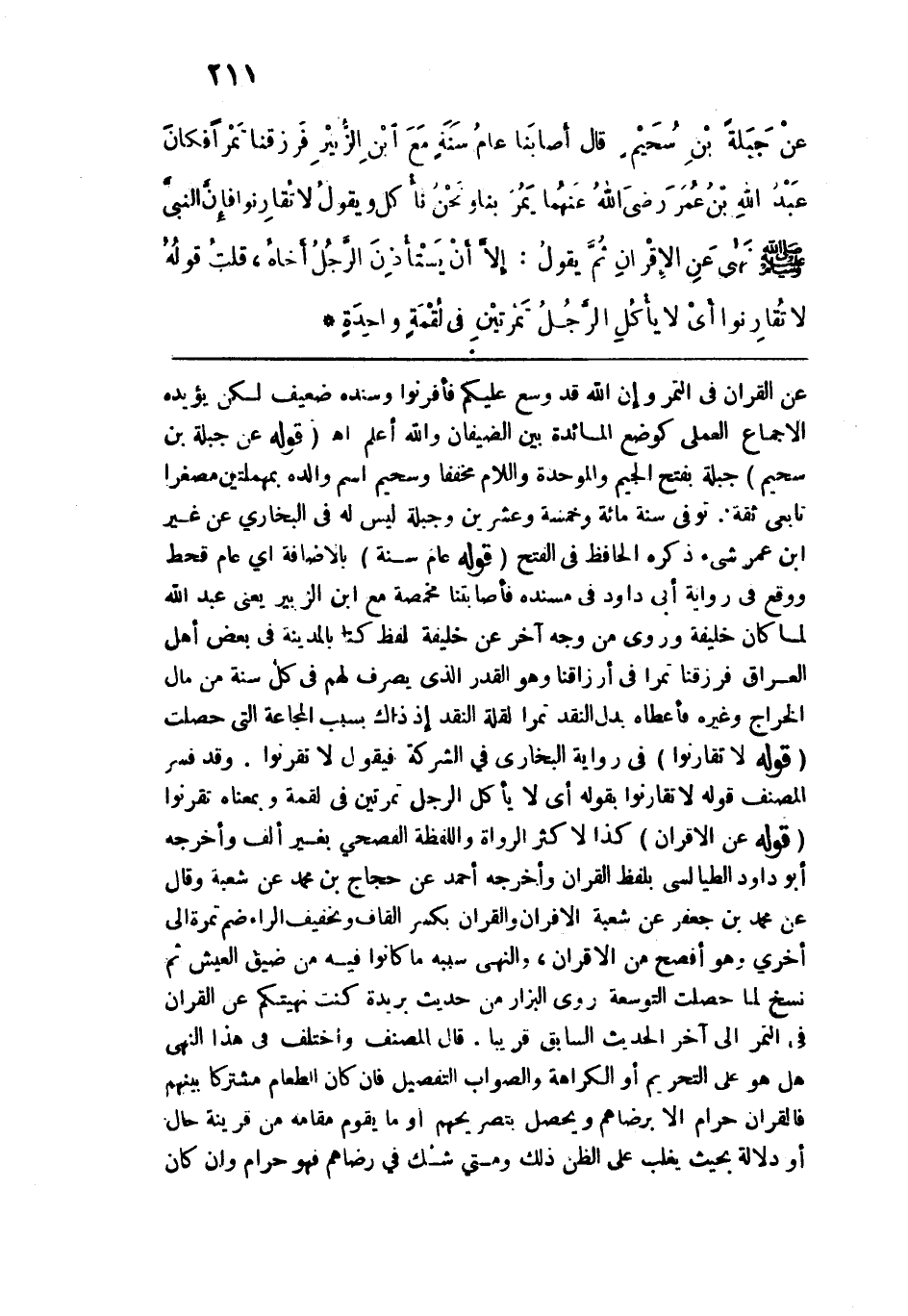 عن جبلة بن سحيم قال: أصابنا عام سنة مع ابن الزبير فرزقنا تمرًا، فكان عبد الله بن عمر رضي الله عنهما يمر بنا ونحن نأكل، ويقول: لا تقارنوا، فإن النبي - صلى الله عليه وسلم - نهى عن الإقران ثم يقول: "إلا أن يَسْتأذِن الرجُلُ أخاهُ".