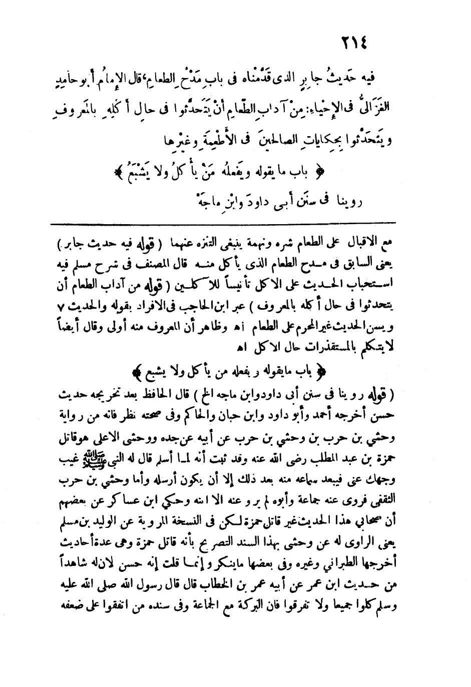 فيه حديث جابر الذي قدمناه في "باب مدح الطعام". قال الإِمام أبو حامد الغزالي في "الإحياء" من آداب الطعام أن يتحدَّثوا في حال أكله بالمعروف، ويتحدثوا بحكايات الصالحين في الأطعمة وغيرها.
