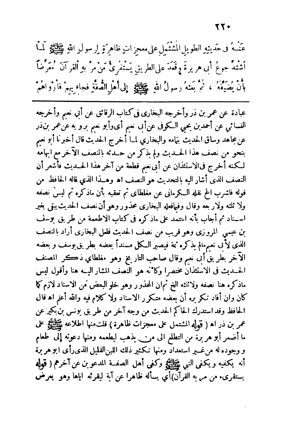 عبادة عن عمر بن ذر وأخرجه البخاري في كتاب الرقائق عن أبي نعيم وأخرجه النسائي عن أحمد بن يحيى الكوفي عن أبي نعيم أي وأبو نعيم يرويه عن عمر بن ذر عن مجاهد وساق الحديث بتمامه والبخاري لما أخرج الحديث قال: أخبرنا أبو نعيم بنحو من نصف هذا الحديث ولم يذكر من حدثه بالنصف الآخر مع إبهامه لكنه أخرج في الاستئذان عن أبي نعيم قطعة من آخر هذا الحديث فأشعر أن النصف الذي أشار إليه بالتحديث هو النصف اهـ. وهذا الذي قاله الحافظ من قوله: فاشرب الخ نقله الكرماني عن مغلطاي ثم تعقبه بأن ما ذكره ثم ليس نصفه ولا ثلثه ولا ربعه وقال وفيما فعله البخاري محذور وهو أن نصف الحديث يبقى بغير إسناد ثم أجاب بأنه اعتمد على ما ذكره في كتاب الأطعمة من طريق يوسف بن عيسى المروزي وهو قريب من نصف الحديث فلعل البخاري أراد بالنصف الذي لأبي نعيم ما لم يذكره ثمة فيصير الكل مسندًا بعضه بطريق يوسف وبعضه الآخر بطريق أبي نعيم وقال صاحب التاريخ وهو مغلطاي ذكر المصنف الحديث في الاستئذان مختصرًا وكأنه هو النصف المشار إليه هنا وأقول ليس ما ذكره هنا نصفه ولا ثلثه الخ، ثم إن المحذور وهو خلو البعض من الإسناد لازم كما كان وإن أفاد تكريره أن بعضه متكرر الإسناد ولا كلام فيه والله أعلم اهـ. قال الحافظ: وفي استدرك الحاكم الحديث من وجه آخر من طريق يونس بن بكير عن عمر بن ذر اهـ. قوله: (المشتمل على معجزات ظاهرة) قلت منها اطلاعه - صلى الله عليه وسلم - على ما أضمر أبو هريرة من التطلع إلى من يذهب ليطعمه ومنها دعوته إلى طعام ووجوده