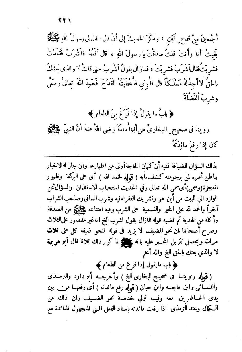 روينا في "صحيح البخاري" عن أبي أمامة رضي الله عنه أن النبي - صلى الله عليه وسلم - كان إذا رفع مائدته