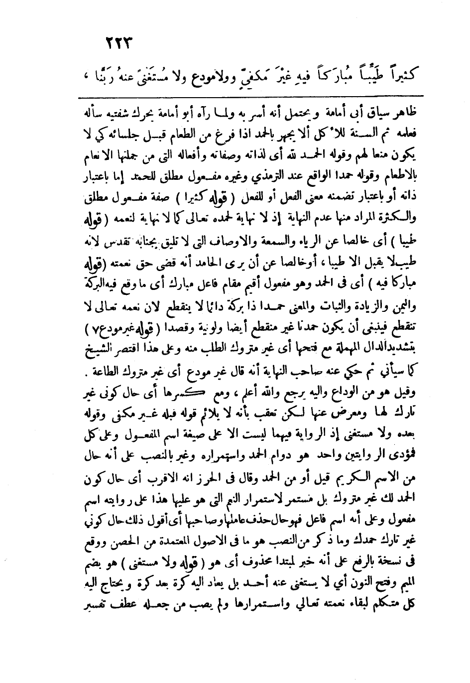 ظاهر سياق أبي أمامة ويحتمل أنه أسر به ولما رآه أبو أمامة يحرك شفتيه سأله فعلمه ثم السنة للأكل ألا يجهر بالحمد إذا فرغ من الطعام قبل جلسائه كي لا يكون منعًا لهم وقوله: الحمد الله أي لذاته وصفاته وأفعاله التي من جملتها الإنعام بالإطعام وقوله: حمدًا الواقع عند الترمذي وغيره مفعول مطلق للحمد إما باعتبار ذاته أو باعتبار تضمنه معنى الفعل أو للفعل. قوله: (كثيرًا) صفة مفعول مطلق والكثرة المراد منها عدم النهاية إذ لا نهاية لحمده تعالى كما لا نهاية لنعمه. قوله: (طيبًا) أي خالصًا عن الرياء والسمعة والأوصاف التي لا تليق بجنابه تقدس لأنه طيب لا يقبل إلا طيبًا، أو خالصًا عن أن يرى الحامد أنه قضى حق نعمته. قوله: (مباركًا فيه) أي في الحمد وهو مفعول أقيم مقام فاعل مبارك أي ما وقع فيه البركة واليمن والزيادة والثبات والمعنى حمدًا ذا بركة دائمًا لا ينقطع لأن نعمه تعالى لا تنقطع فينبغي أن يكون حمدنا غير منقطع أيضًا ولونية وقصدًا. قوله: (غير مودع) بتشديد الدال المهملة مع فتحها أي غير متروك الطلب منه وعلى هذا اقتصر الشيخ كما سيأتي ثم حكى عنه صاحب النهاية أنه قال غير مودع أي غير متروك الطاعة. وقيل هو من الوداع وإليه يرجع والله أعلم، ومع كسرها أي حال كوني غير تارك لها ومعرض عنها لكن تعقب بأنه لا يلائم قوله قبله غير مكفي وقوله بعده ولا مستغنى إذ الرواية فيهما ليست إلا على صيغة اسم المفعول وعلى كل فمؤدى الروايتين واحد هو دوام الحمد واستمراره وغير بالنصحب على أنه حال من الاسم الكريم قيل: أو من اهـ حمد وقال في الحرز إنه الأقرب أي حال كون الحمد لك غير متروك بل مستمر لاستمرار النعم التي هو عليها هذا على روايته اسم مفعول وعلى أنه اسم فاعل فهو حال حذف عاملها وصاحبها أي أقول ذلك حال كوني غير تارك حمدك وما ذكر من النصب هو ما في الأصول المعتمدة من الحصن ووقع في نسخة بالرفع على أنه خبر لمبتدأ محذوف أي هو. قوله: (ولا مستغنى) هو بضم الميم وفتح النون أي لا يستغني عنه أحد بل يعاد إليه كرة بعد كرة ويحتاج إليه كل متكلم لبقاء نعمته تعالى واستمرارها ولم يصب من جعله عطف تفسير
