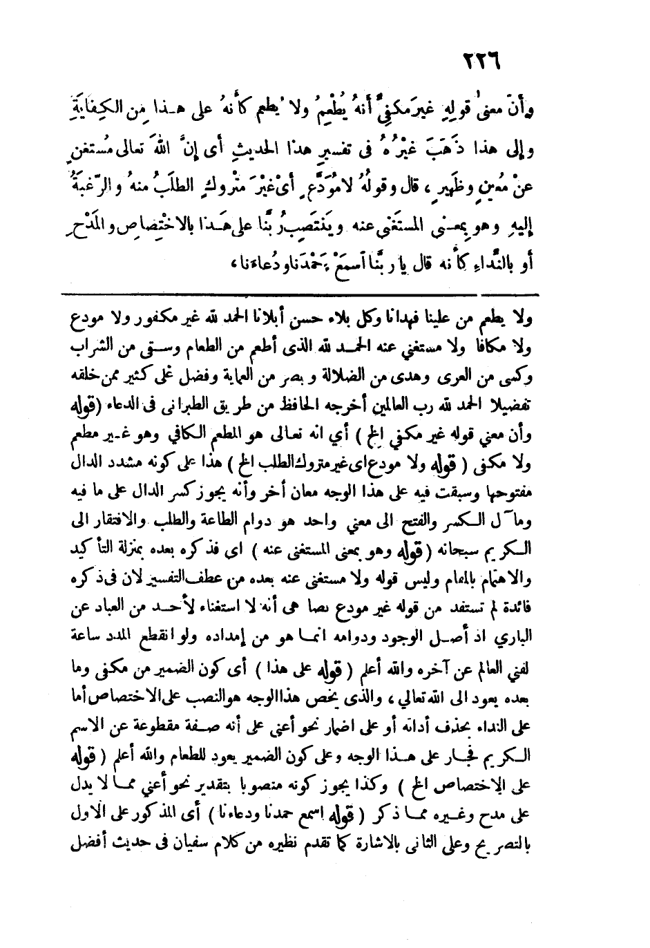 ولا يطعم منَّ علينا فهدانا وكل بلاء حسن أبلانا الحمد الله غير مكفور ولا مودع ولا مكافأ ولا مستغنى عنه الحمد الله الذي أطعم من الطعام وسقى من الشراب وكسى من العري وهدى من الضلالة وبصر من العماية وفضل على كثير ممن خلقه تفضيلًا الحمد الله رب العالمين أخرجه الحافظ من طريق الطبراني في الدعاء. قوله: (وأن معنى قوله غير مكفي الخ) أي إنه تعالى هو المطعم الكافي وهو غير مطعم ولا مكفي. قوله: (ولا مودع أي غير متروك الطلب الخ) هذا على كونه مشدد الدال مفتوحها وسبقت فيه على هذا الوجه معان أخر وأنه يجوز كسر الدال على ما فيه ومآل الكسر والفتح إلى معنى واحد هو دوام الطاعة والطلب والافتقار إلى الكريم سبحانه. قوله: (وهو بمعنى المستغنى عنه) أي فذكره بعده بمنزلة التأكيد والاهتمام بالمقام وليس قوله ولا مستغنى عنه بعده من عطف التفسير لأن في ذكره فائدة لم تستفد من قوله غير مودع نصًّا هي أنه لا استغناء لأحد من العباد عن الباري إذ أصل الوجود ودوامه إنما هو من إمداده ولو انقطع المدد ساعة لفني العالم عن آخره والله أعلم. قوله: (على هذا) أي كون الضمير من مكفي وما بعده يعود إلى الله تعالى، والذي يخص هذا الوجه هو النصب على الاختصاص أما على النداء بحذف أداته أو على اضمار نحو أعني على أنه صفة مقطوعة عن الاسم الكريم فجاز على هذا الوجه وعلى كون الضمير يعود للطعام والله أعلم. قوله: (على الاختصاص الخ) وكذا يجوز كونه منصوبًا بتقدير نحو أعني مما لا يدل قوله مدح وغيره مما ذكر .. قوله: (اسمع حمدنا ودعاءنا) أي المذكور على الأول بالتصريح وعلى الثاني بالإشارة كما تقدم نظيره من كلام سفيان في حديث أفضل
