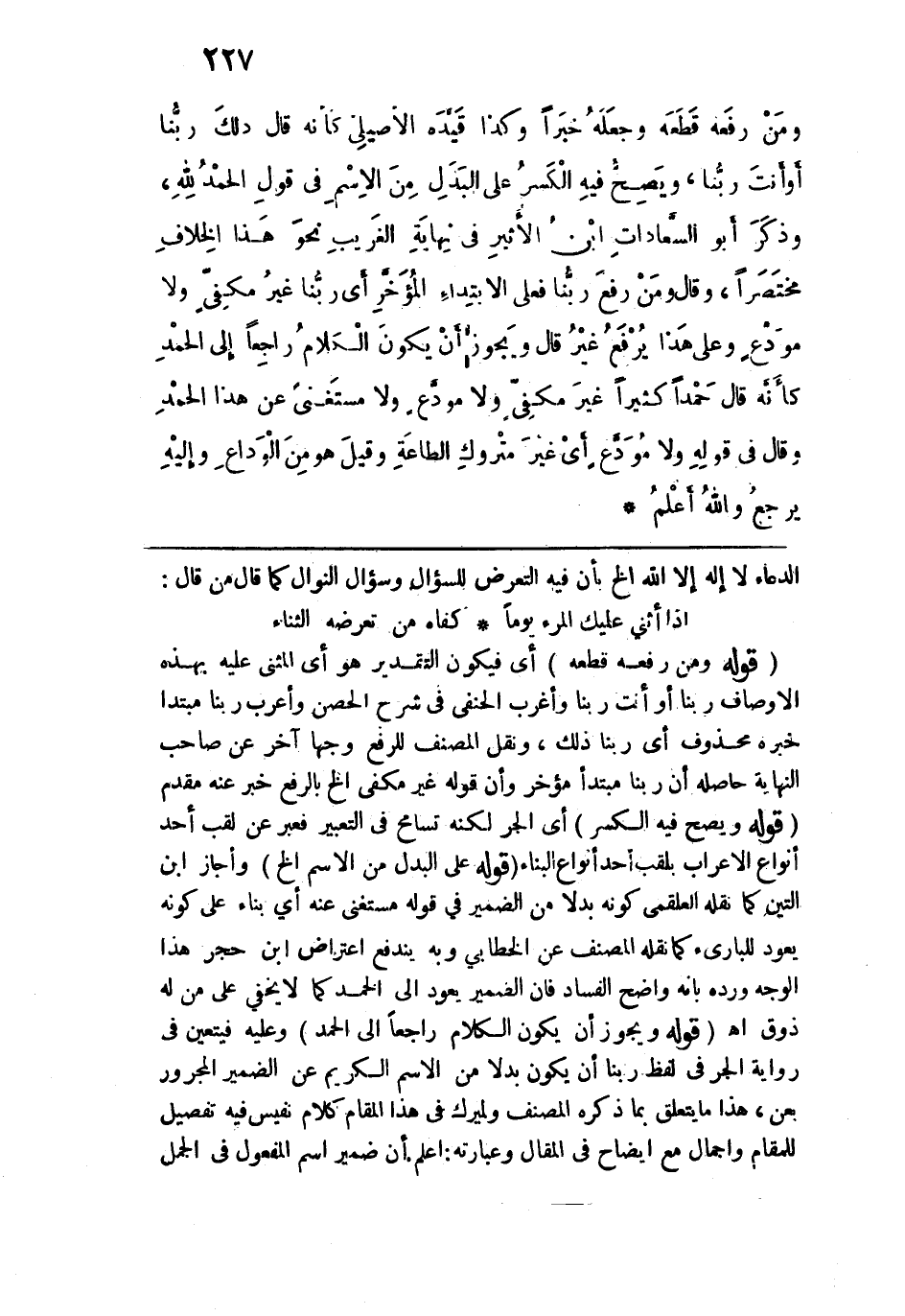 قوله: (ومن رفعه قطعه) أي فيكون التقدير هو أي المثني عليه بهذه الأوصاف ربنا أو أنت ربنا وأغرب الحنفي في شرح الحصن وأعرب ربنا مبتدأ خبره محذوف أي ربنا ذلك، ونقل المصنف للرفع وجهًا آخر عن صاحب النهاية حاصله أن ربنا مبتدأ مؤخر وأن قوله غير مكفي الخ بالرفع خبر