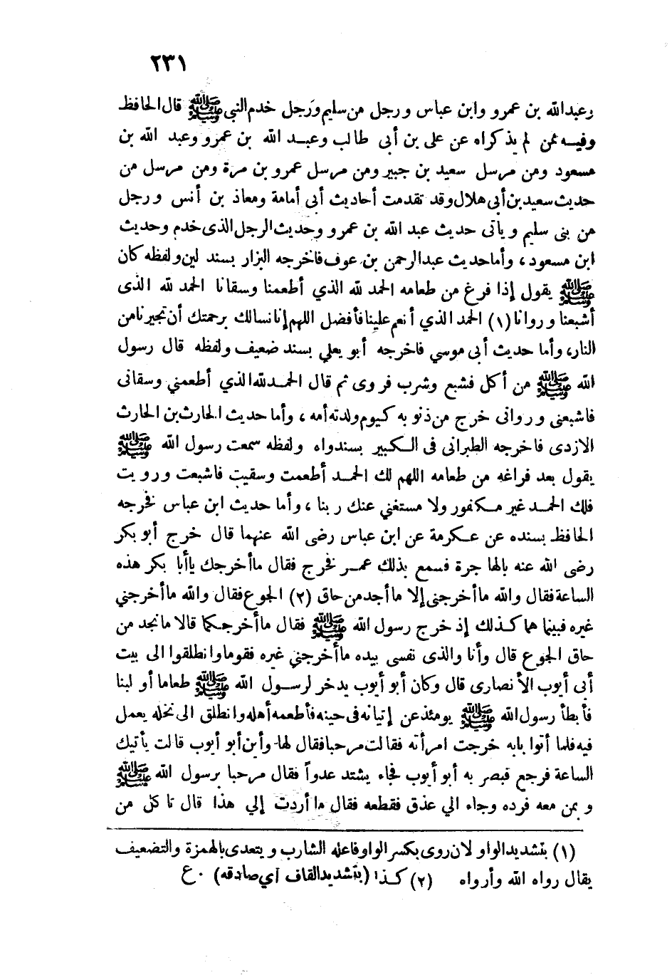 وعبد الله بن عمرو وابن عباس ورجل من سليم ورجل خدم النبي - صلى الله عليه وسلم - قال الحافظ: وفيه ممن لم يذكراه عن علي بن أبي طالب وعبد الله بن عمرو وعبد الله بن مسعود - رضي الله عنهما - ومن مرسل سعيد بن جبير ومن مرسل عمرو بن مرة ومن مرسل من حديث سعيد بن أبي هلال وقد تقدمت أحاديث أبي أمامة ومعاذ بن أنس ورجل من في سليم ويأتي حديث عبد الله بن عمرو وحديث الرجل الذي خدم وحديث ابن مسعود، وأما حديث عبد الرحمن بن عوف فأخرجه البزار بسند لين ولفظه كان - صلى الله عليه وسلم - يقول إذا فرغ من طعامه الحمد الله الذي أطعمنا وسقانا الحمد الله الذي أشبعنا وروانا الحمد الله الذي أنعم علينا فأفضل اللهم إنا نسألك برحمتك أن تجيرنا من النار، وأما حديث أبي موسى فأخرجه أبو يعلى بسند ضعيف ولفظه قال رسول الله - صلى الله عليه وسلم -: "من أكل فشجع وشرب فروى" ثم قال: "الحمد الله الذي أطعمني وسقاني فأشبعني وأرواني" خرج من ذنوبه كيوم ولدته أمه، وأما حديث الحارث بن الحارث الأزدي فأخرجه الطبراني في الكبير بسند واه ولفظه سمعت رسول الله - صلى الله عليه وسلم - يقول بعد فراغه من طعامه: "اللهم لك الحمد أطعمت وسقيت فأشبعت ورويت ذلك الحمد غير مكفور ولا مستغنى عنك ربنا"، وأما حديث ابن عباس فخرجه الحافظ بسنده عن عكرمة عن ابن عباس رضي الله عنهما قال: خرج أبو بكر رضي الله عنه بالهاجرة فسمع بذلك عمر - رضي الله عنه - فخرج فقال: ما أخرجك يا أبا بكر هذه الساعة؟ فقال: والله ما أخرجني إلا ما أجد من حاق الجوع، فقال: والله ما أخرجني غيره فبينما هما كذلك إذ خرج رسول الله - صلى الله عليه وسلم - فقال: "ما أخرجكما" قالا: ما نجد من حاق الجوع؟ قال: "وأنا والذي نفسي بيده ما أخرجني غيره فقدما وانطلقوا إلى بيت أبي أيوب الأنصاري" قال وكان أبو أيوب يدخر لرسول الله - صلى الله عليه وسلم - طعامًا أو لبنًا فأبطأ رسول الله - صلى الله عليه وسلم - يومئذٍ عن إتيانه في حينه فأطعمه أهله وانطلق إلى نخله يعمل فيه فلما أتوا بابه خرجت امرأته فقالت: مرحبًا، فقال لها: "وأين أبو أيوب؟ " قالت: يأتيك الساعة فرجع فبصر به أبو أيوب فجاء يشتد عدوًا فقال: مرحبًا برسول الله - صلى الله عليه وسلم - وبمن معه فرده وجاء إلى عذق فقطعه فقال: ما أردت إلي هذا! قال: تأكل من