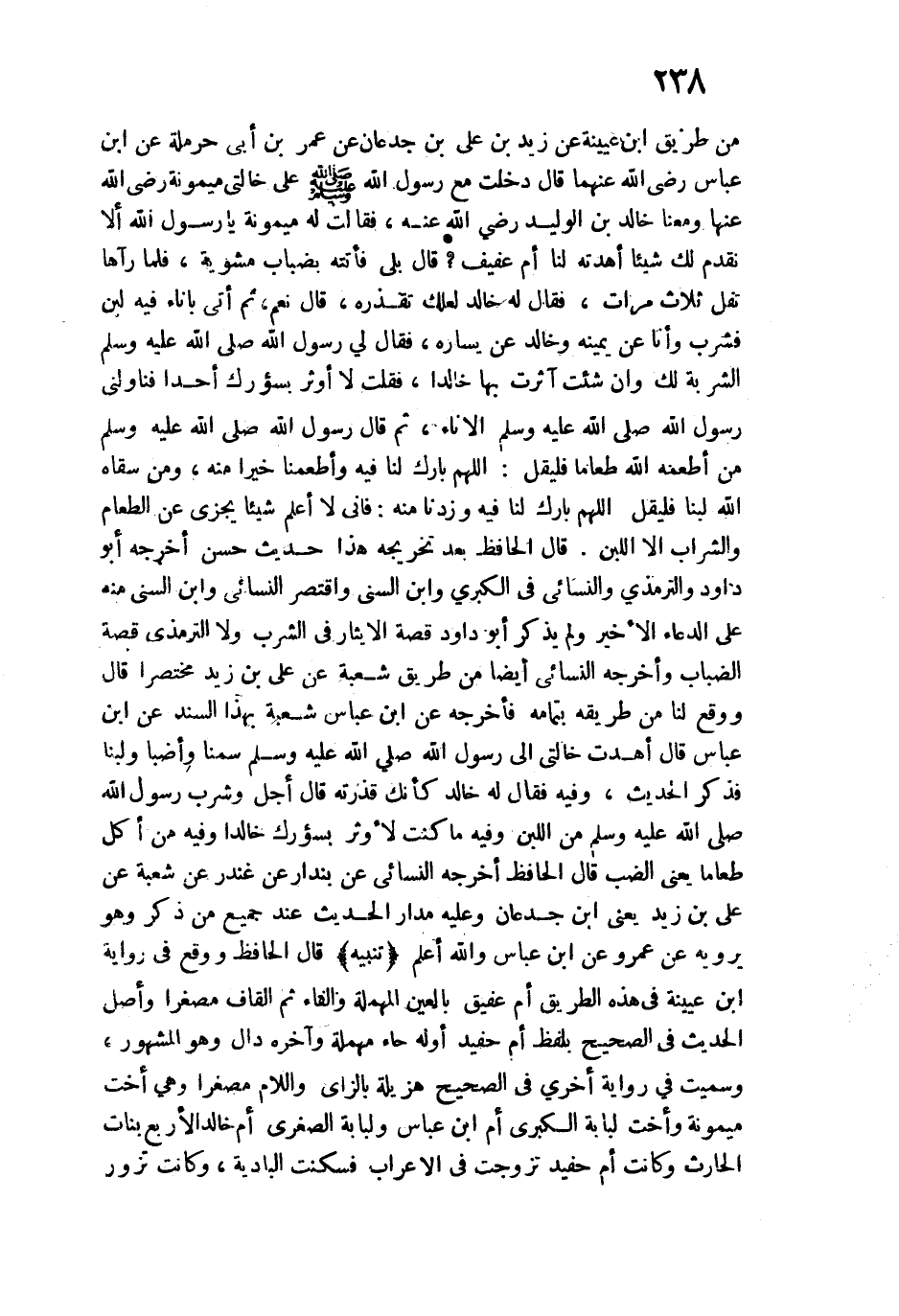 زيد بن علي بن جدعان عن عمر بن أبي حرملة عن ابن عباس رضي الله عنهما قال: دخلت مع رسول الله - صلى الله عليه وسلم - على خالتي ميمونة رضي الله عنها ومعنا خالد بن الوليد رضي الله عنه، فقالت له ميمونة: يا رسول الله ألا تقدم لك شيئًا أهدته لنا أم عفيف؟ قال: بلى فأتته بضباب مشوية، فلما رآها تغل ثلاث مرات، فقال له خالد لعلك تقذره، قال: نعم، ثم أتى بإناء فيه لبن فشرب وأنا عن يمينه وخالد عن يساره، فقال لي رسول الله - صلى الله عليه وسلم -: "الشربة لك وإن شئت اثرت بها خالدا"، فقلت: لا أوثر بسؤرك أحدًا فناولني رسول الله - صلى الله عليه وسلم - الإناء، ثم قال رسول الله - صلى الله عليه وسلم -: "من أطعمه الله طعامًا فليقل: اللهم بارك لنا فيه وأطعمنا خيرًا منه، ومن سقاه الله لبنًا فليقل: اللهم بارك لنا فيه وزدنا منه: فإني لا أعلم شيئًا يجزي عن الطعام والشراب إلا اللبن. قال الحافظ بعد تخريجه: هذا حديث حسن أخرجه أبو داود والترمذي والنسائي في الكبرى وابن السني واقتصر النسائي وابن السني منه على الدعاء الأخير ولم يذكر أبو داود قصة الإيثار في الشرب ولا الترمذي قصة الضباب وأخرجه النسائي أيضًا من طريق شعبة عن علي بن زيد مختصرًا قال ووقع لنا من طريقه بتمامه فأخرجه عن ابن عباس شعبة بهذا السند عن ابن عباس قال: أهدت خالتي إلى رسول الله - صلى الله عليه وسلم - سمنًا وأضبًا ولبنًا فذكر الحديث، وفيه فقال له خالد: كأنك قذرته، قال: أجل وشرب رسول الله - صلى الله عليه وسلم - من اللبن وفيه ما كنت لأوثر بسؤرك خالدًا وفيه من أكل طعامًا يعني الضب قال الحافظ: أخرجه النسائي عن بندار عن غندر عن شعبة عن علي بن زيد يعني ابن جدعان وعليه مدار الحديث عند جميع من ذكر وهو يرويه عن عمرو عن ابن عباس والله أعلم.