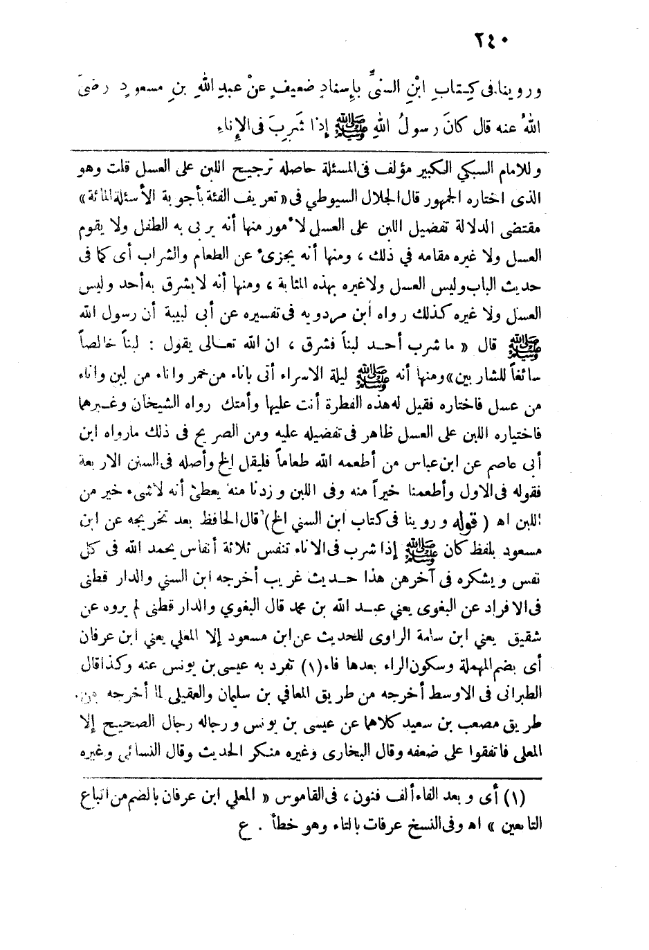 وللإمام السبكي الكبير مؤلف في المسألة حاصله ترجيح اللبن علي العسل قلت وهو الذي اختاره الجمهور قال الجلال السيوطي في "تعريف الفئة بأجوبة الأسئلة المائة" مقتضى الدلالة تفضيل اللبن علي العسل لأمور منها أنه يربى به الطفل ولا يقوم العسل ولا غيره مقامه في ذلك، ومنها أنه يجزئ عن الطعام والشراب أي كما في حديث الباب وليس العسل ولا غيره بهذه المثابة، ومنها أنه لا يشرق به أحد وليس العسل ولا غيره كذلك رواه ابن مردويه في تفسيره عن أبي لبيبة أن رسول الله - صلى الله عليه وسلم - قال: "ما شرب أحد لبنًا فشرق، إن الله تعالى يقول: {لَبَنًا خَالِصًا سَائِغًا لِلشَّارِبِينَ} ومنها أنه - صلى الله عليه وسلم - ليلة الإسراء أتى بإناء من خمر وإناء من لبن وإناء من عسل فاختاره فقيل له: هذه الفطرة أنت عليها وأمتك رواه الشيخان وغيرهما فاختياره اللبن علي العسل ظاهر في تفصيله عليه ومن الصريح في ذلك ما رواه ابن أبي عاصم عن ابن عباس من أطعمه الله طعامًا فليقل الخ وأصله في السنن الأربعة فقوله في الأول: وأطعمنا خيرًا منه وفي اللبن وزدنا منه يعطى أنه لا شيء خير من اللبن اهـ.