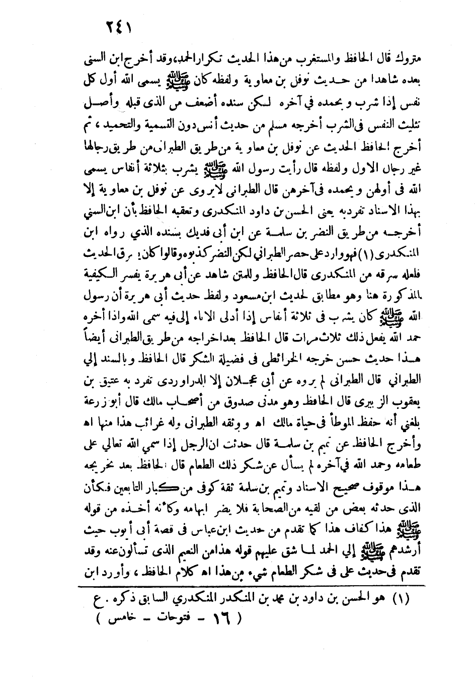 شرب ويحمده في آخره لكن سنده أضعف من الذي قبله وأصل تثليث النفس في الشرب أخرجه مسلم من حديث أنس دون التسمية والتحميد، ثم أخرج الحافظ الحديث عن نوفل بن معاوية من طريق الطبراني من طريق رجالها غير رجال الأول ولفظه قال: رأيت رسول الله - صلى الله عليه وسلم - يشرب بثلاثة أنفاس يسمي الله في أولهن ويحمده في آخرهن قال الطبراني لا يروي عن نوفل بن معاوية إلا بهذا الإسناد تفرد به يعني الحسن بن داود المنكدري وتعقبه الحافظ بأن ابن السني أخرجه من طريق النضر بن سلمة عن ابن أبي فديك بسنده الذي رواه ابن المنكدري فهو وارد على حصر الطبراني لكن النضر كذبوه وقالوا: كان يسرق الحديث فلعله سرقه من المنكدري قال الحافظ: وللمتن شاهد عن أبي هريرة يفسر الكيفية المذكورة هنا وهو مطابق لحديث ابن مسعود ولفظ حديث أبي هريرة أن رسول الله - صلى الله عليه وسلم - كان يشرب في ثلاثة أنفاس إذا أدلى الإناء إلى فِيهِ سمى الله وإذا آخره حمد الله يفعل ذلك ثلاث مرات قال الحافظ بعد إخراجه من طريق الطبراني أيضًا: هذا حديث حسن خرجه الخرائطي في فضيلة الشكر قال الحافظ وبالسند إلى الطبراني قال الطبراذي: لم يروه عن أبي عجلان إلا الدراوردي تفرد به عتيق بن يعقوب الزبيري قال الحافظ وهو مدني صدوق من أصحاب مالك قال أبو زرعة: بلغني أنه حفظ الموطأ في حياة مالك اهـ. ووثقه الطبراني وله غرائب هذا منها اهـ. وأخرج الحافظ عن تميم بن سلمة قال: حدثت أن الرجل إذا سمى الله تعالى على طعامه وحمد الله في آخره لم يسأل عن شكر ذلك الطعام، قال الحافظ بعد تخريجه: هذا موقوف صحيح الإسناد وتميم بن سلمة ثقة كوفي من كبار التابعين فكان الذي حدثه بعض من لقيه من الصحابة فلا يضر إبهامه وكأنه أخذه من قوله - صلى الله عليه وسلم -: "هذا كفاف" هذا كما تقدم من حديث ابن عباس في قصة أبي أيوب حيث أرشدهم - صلى الله عليه وسلم - إلى الحمد لما شق عليهم قوله: "هذا من النعم الذي تسألون عنه" وقد تقدم في حديث علي في شكر الطعام شيء من هذا اهـ. كلام الحافظ، وأورد ابن