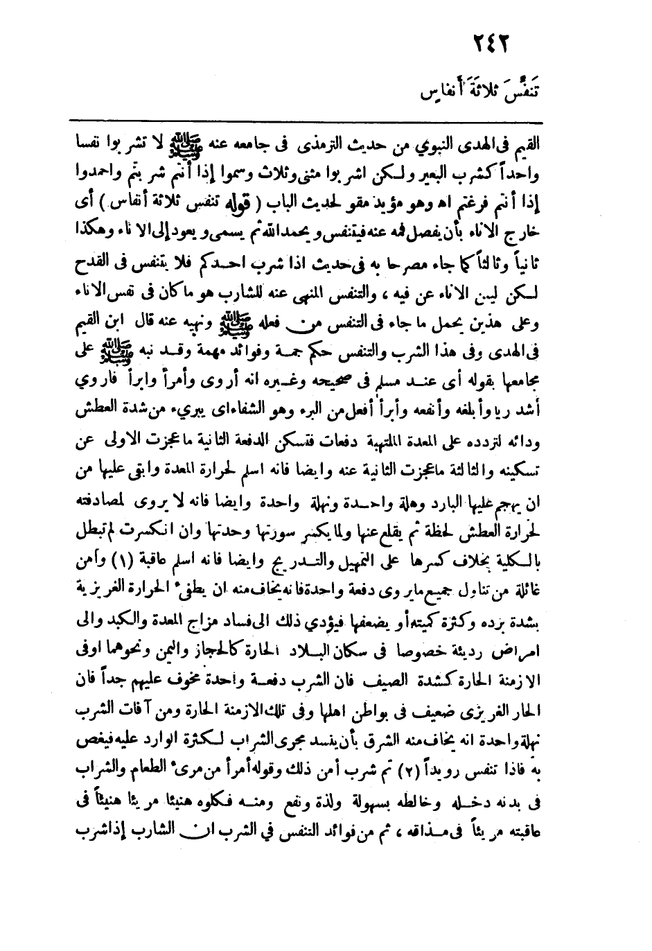 القيم في الهدي النبوي من حديث الترمذي في جامعه عنه - صلى الله عليه وسلم -: "لا تشربوا نفسًا واحدًا كشرب البعير ولكن اشربوا مثنى وثلاث وسموا إذا أنتم شربتم واحمدوا إذا أنتم فرغتم" اهـ وهو مؤيد مقو لحديث الباب. قوله: (تنفس ثلاثة أنفاس) أي خارج الإناء بأن يفصل فمه عنه فيتنفس ويحمد الله ثم يسمي ويعود إلى الإناء وهكذا ثانيًا وثالثًا كما جاء مصرحًا به في حديث إذا شرب أحدكم فلا يتنفس في القدح لكن ليس الإناء عن فِيهِ، والتنفس المنهي عنه للشارب هو ما كان في نفس الإناء وعلى هذين يحمل ما جاء في التنفس من فعله - صلى الله عليه وسلم - ونهيه عنه قال ابن القيم في الهدي وفي هذا الشراب والتنفس حكم جمة وفؤائد مهمة وقد نبه - صلى الله عليه وسلم - على مجامعها بقوله أي عند مسلم في صحيحه وغيره أنه أروى وأمرأ وأبرأ فأروى أشد ريًّا وأبلغه وأنفعه وأبرأ أفعل من البرء وهو الشفاء أي يبرئ من شدة العطش ودائه لتردده على المعدة الملتهبة دفعات فتسكن الدفعة الثانية ما عجزت الأولى عن تسكينه والثالثة ما عجزت الثانية عنه وأيضًا فإنه أسلم لحرارة المعدة وأبقى عليها من أن يهجم عليها البارد وهلة واحدة ونهلة واحدة وأيضًا فإنه لا يروي لمصادفته لحرارة العطش لحظة ثم يقلع عنها ولما يكسر سورتها وحدتها وإن انكسرت لم تبطل بالكلية بخلاف كسرها