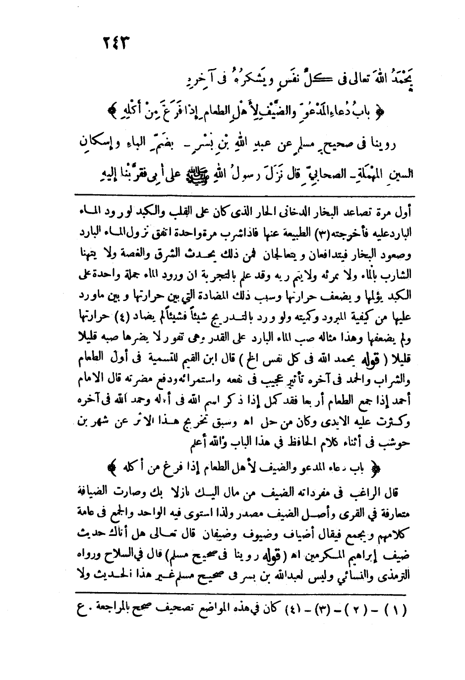 قال الراغب في مفرداته الضيف من مال إليك نازلًا بك وصارت الضيافة متعارفة في القرى وأصل الضيف مصدر ولذا استوى فيه الواحد والجمع في عامة كلامهم ويجمع فيقال: أضياف وضيوف وضيفان قال تعالى: {هَلْ أَتَاكَ حَدِيثُ ضَيْفِ إِبْرَاهِيمَ الْمُكْرَمِينَ} اهـ. قوله: (روينا في صحيح مسلم) قال في السلاح ورواه الترمذي والنسائي وليس لعبد الله بن بسر في صحيح مسلم غير هذا الحديث ولا