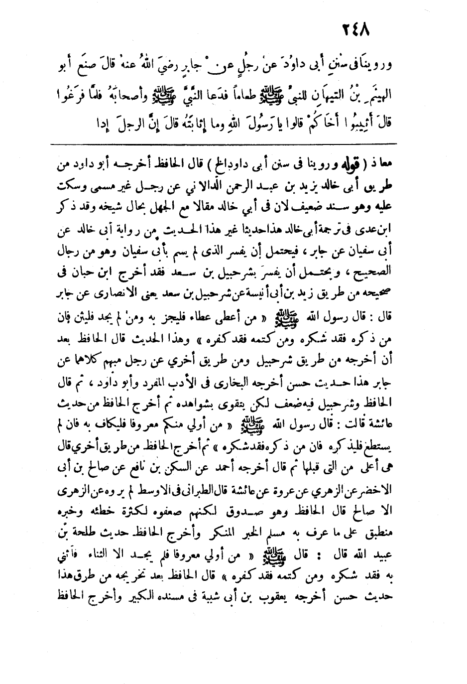 قوله: (وروينا في سنن أبي داود الخ) قال الحافظ: أخرجه أبو داود من طريق أبي خالد يزيد بن عبد الرحمن الدالاني عن رجل غير مسمى وسكت عليه وهو سند ضعيف لأن في أبي خالد مقالًا مع الجهل بحال شيخه وقد ذكر ابن عدي في ترجمة أبي خالد هذا حديثًا غير هذا الحديث من رواية أبي خالد عن أبي سفيان عن جابر، فيحتمل أن يفسر الذي لم يسم بأبي سفيان وهو من رجال الصحيح، ويحتمل أن يفسر بشرحبيل بن سعد فقد أخرج ابن حبان في صحيحه من طريق زيد بن أبي أنيسة عن شرحبيل بن سعد يعني الأنصاري عن جابر قال: قال رسول الله - صلى الله عليه وسلم -: "من أعطى عطاء فليجز به ومن لم يجد فليثن فإن من ذكره فقد شكره ومن كتمه فقد كفره" وهذا الحديث قال الحافظ بعد أن أخرجه من طريق شرحبيل ومن طريق أخرى عن رجل مبهم كلاهما عن جابر هذا حديث حسن أخرجه البخاري في الأدب المفرد وأبو داود، ثم قال الحافظ وشرحبيل فيه ضعف لكن يتقوى بشواهده ثم أخرج الحافظ من حديث عائشة قالت: قال رسول الله - صلى الله عليه وسلم -: "من أولى منكم معروفًا فليكاف به فإن لم يستطع فليذكره فإن من ذكره فقد شكره" ثم أخرج الحافظ من طريق أخرى قال: هي أعلى من التي قبلها ثم قال: أخرجه أحمد عن السكن بن نافع عن صالح بن أبي الأخضر عن الزهري عن عروة عن عائشة قال الطبراني في الأوسط لم يروه عن الزهري إلا صالح قال الحافظ: وهو صدوق لكنهم ضعفوه لكثرة خطئه وخبره منطبق على ما عرف به مسلم الخبر المنكر وأخرج الحافظ حديث طلحة بن عبيد الله قال: قال - صلى الله عليه وسلم -: "من أولى معروفًا فلم يجد إلا الثناء فأثنى به فقد شكره ومن كتمه فقد كفره" قال الحافظ بعد تخريجه من طرق: هذا حديث حسن أخرجه يعقوب بن أبي شيبة في مسنده الكبير وأخرج الحافظ