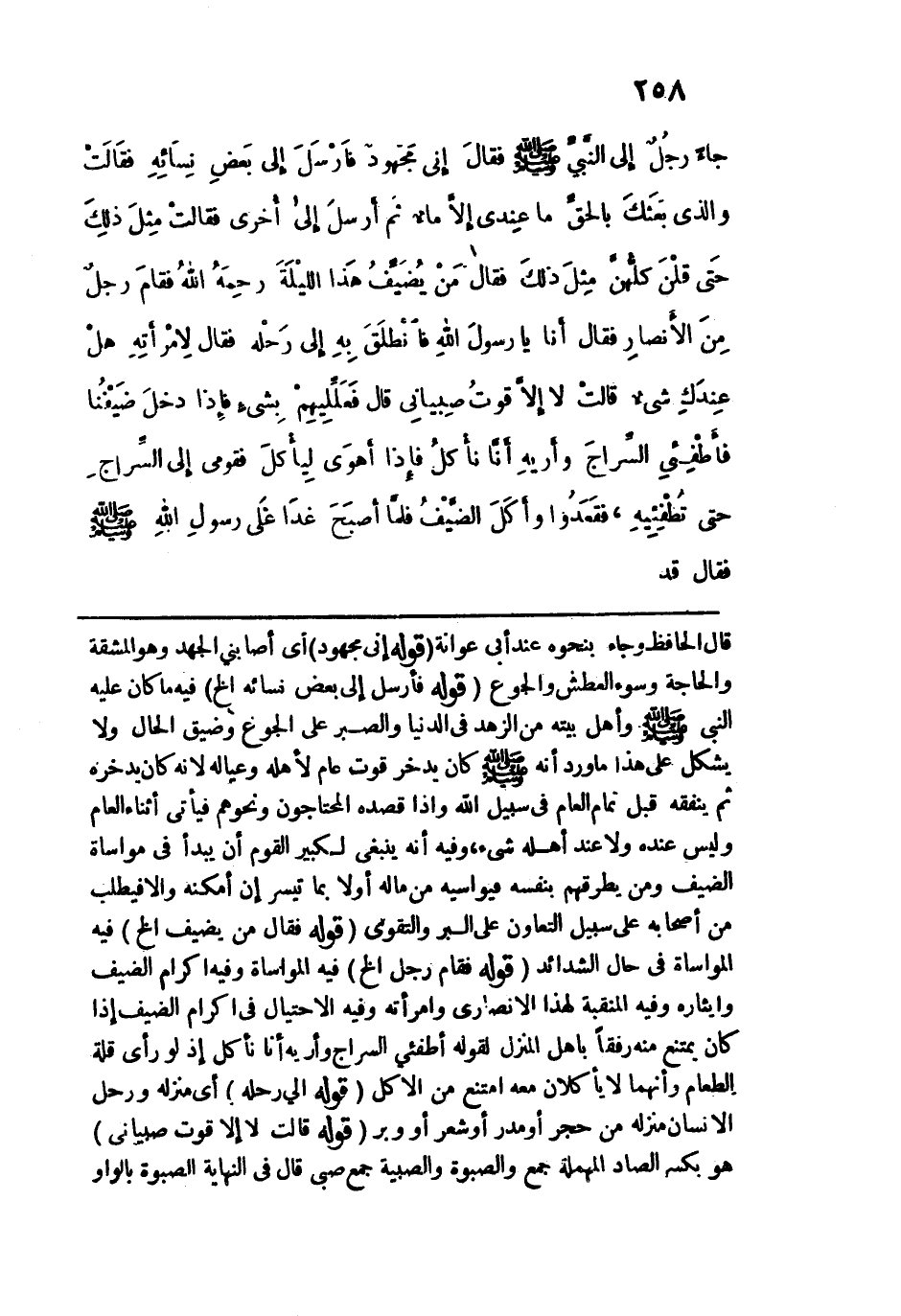 جاء رجل إلى النبي - صلى الله عليه وسلم - فقال إني مجهود، فأرسل إلى بعض نسائه فقالت: والذي بعثك بالحق ما عندي إلا ماء، ثم أرسل إلى أخرى فقالت مثل ذلك، حتى قلن كلهن مثل ذلك، فقال: مَنْ يُضيفُ هذا الليْلةَ رَحِمَهُ اللهُ، فقام رجل من الأنصار فقال: أنا يا رسول الله، فانطلق به إلى رحله فقال لامرأته: هل عندك شيء؟ قالت: لا، إلا قوتَ صبياني، قال: فعلِّلِيهم بشيء، فإذا دخل ضيفنا فأطفئي السراج وأريه أنا نأكل، فإذا أهوى ليأكل فقدمي إلى السراج حتى تطفئيه، فقعدوا وأكل الضيف، فلما أصبح غدا على رسول الله - صلى الله عليه وسلم -، فقال: قد