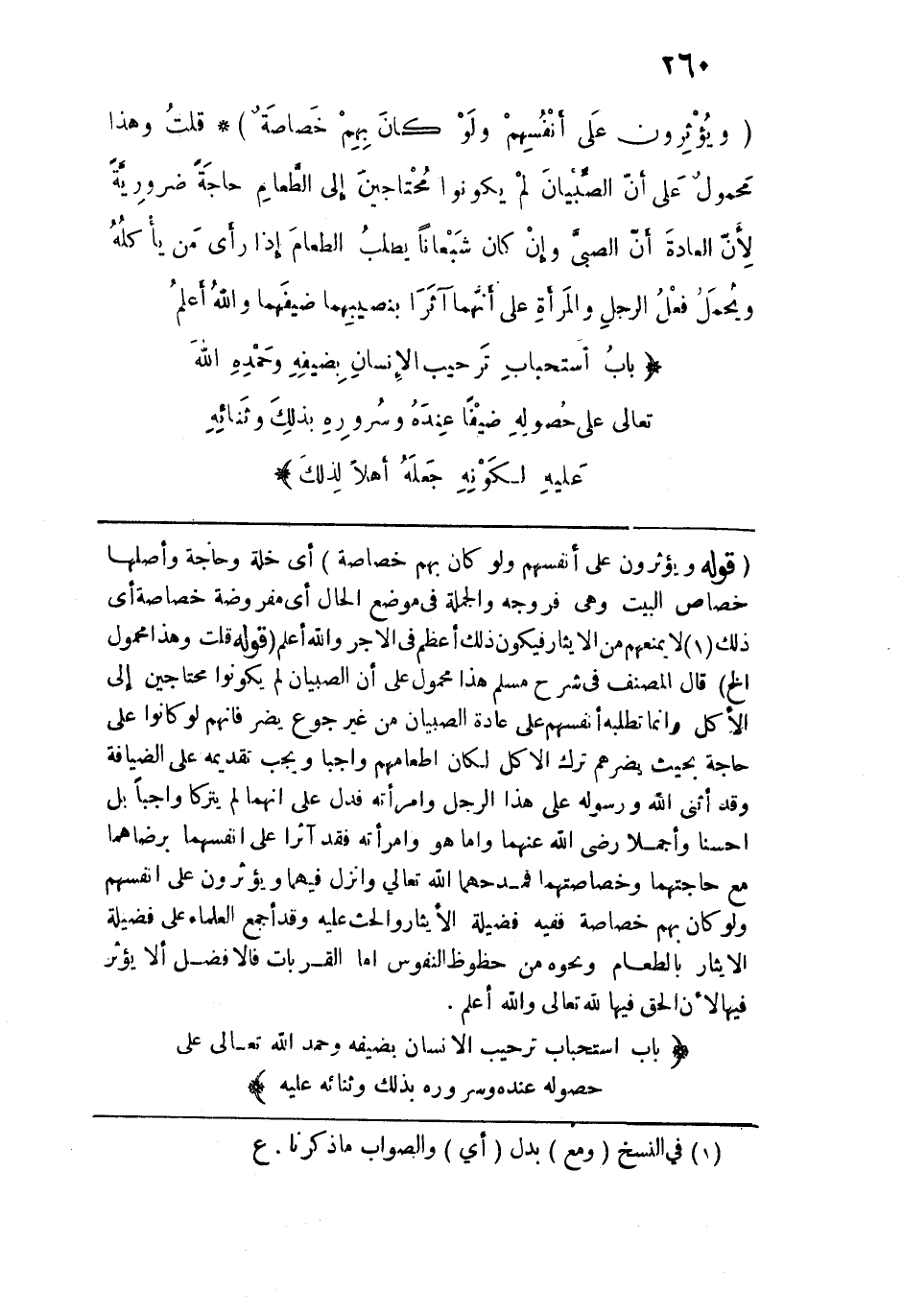 قوله: {وَيُؤْثِرُونَ عَلَى أَنْفُسِهِمْ وَلَوْ كَانَ بِهِمْ خَصَاصَةٌ} أي خلة وحاجة وأصلها خصاص البيت وهي فروجه والجملة في موضع الحال أي مفروضة خصاصة أي ذلك لا يمنعهم من الإيثار فيكون ذلك أعظم في الأجر والله أعلم. قوله: (قلت وهذا محمول الخ) قال المصنف في شرح مسلم هذا محمول على أن الصبيان لم يكونوا محتاجين إلى الأكل وإنما تطلبه أنفسهم على عادة الصبيان من غير جوع يضر فإنهم لو كانوا على حاجة بحيث يضرهم ترك الأكل لكان إطعامهم واجبًا ويجب تقديمه على الضيافة وقد أثنى الله ورسوله على هذا الرجل وامرأته فدل على أنهما لم يتركا واجبًا بل أحسنا وأجملا رضي الله عنهما وأما هو وامرأته فقد آثرا على أنفسهما برضاهما مع حاجتهما وخصاصتهما فمدحهما الله تعالى وأنزل فيهما {وَيُؤْثِرُونَ عَلَى أَنْفُسِهِمْ وَلَوْ كَانَ بِهِمْ خَصَاصَةٌ} ففيه فضيلة الإيثار والحث عليه وقد أجمع العلماء على فضيلة الإيثار بالطعام ونحوه من حظوظ النفوس أما القربات فالأفضل ألا يؤثر فيها لأن الحق فيها الله تعالى والله أعلم.