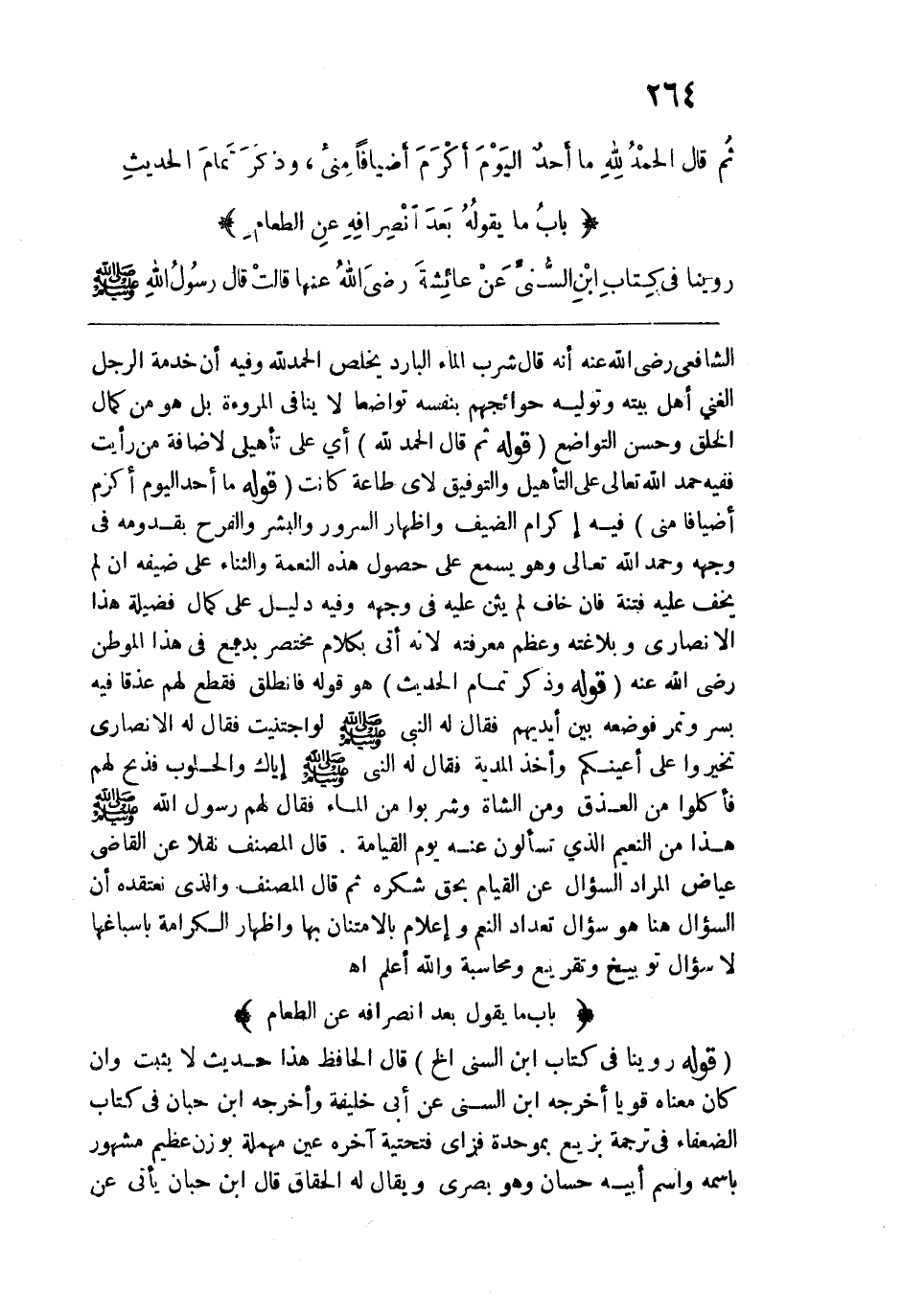 الشافعي رضي الله عنه أنه قال: شرب الماء البارد يخلص الحمد الله وفيه أن خدمة الرجل الغني أهل بيته وتوليه حوائجهم بنفسه تواضعًا لا ينافي المروءة بل هو من كمال الخلق وحسن التواضع. قوله: (ثم قال: الحمد الله) أي على تأهيلي لإضافة من رأيت ففيه حمد الله تعالى على التأهيل والتوفيق لأي طاعة كانت. قوله: (ما أحد اليوم أكرم أضيافًا مني) فيه إكرام الضيف وإظهار السرور والبشر والفرح بقدومه في وجهه وحمد الله تعالى وهو يسمع على حصول هذه النعمة والثناء على ضيفه إن لم يخف عليه فتنة فإن خاف لم يثن عليه في وجهه وفيه دليل على كمال فضيلة هذا الأنصاري وبلاغته وعظم معرفته لأنه أتى بكلام مختصر بديع في هذا الموطن رضي الله عنه. قوله: (وذكر تمام الحديث) هو قوله فانطلق فقطع لهم عذقًا فيه بسر وتمر فوضعه بين أيديهم فقال وله النبي - صلى الله عليه وسلم -: "لو اجتنيت" فقال له الأنصاري: تخيروا على أعينكم وأخذ المدينة فقال له النبي - صلى الله عليه وسلم -: "إياك والحلوب" فذبح لهم فأكلوا من العذق ومن الشاة وشربوا من الماء فقال لهم رسول الله - صلى الله عليه وسلم -: "هذا من النعيم الذي تسألن عنه يوم القيامة". قال المصنف نقلًا عن القاضي عياض المراد السؤال عن القيام بحق شكره ثم قال المصنف والذي نعتقده أن السؤال هنا هو سؤال تعداد النعم وإعلام بالامتنان بها وإظهار الكرامة بإسباغها لا سؤال توبيخ وتقريع ومحاسبة والله أعلم اهـ.