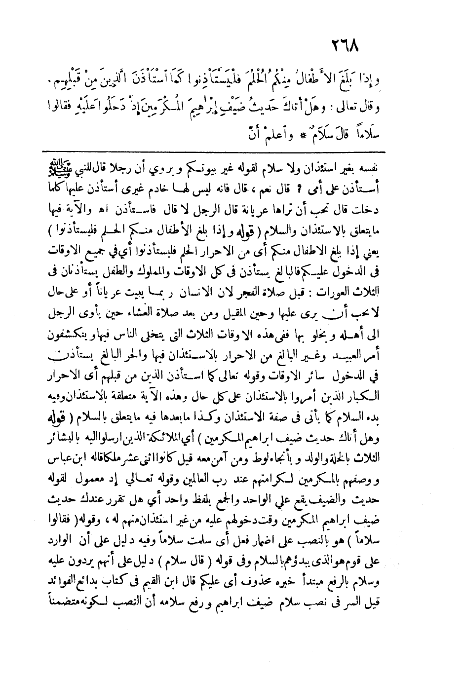 نفسه بغير استئذان ولا سلام لقوله: غير بيوتكم ويروى أن رجلًا قال للنبي - صلى الله عليه وسلم -: أستأذن على أمي؟ قال: "نعم"، قال: فإنه ليس لها خادم غيري أستأذن عليها كلما دخلت؟ قا هـ: "تحب أن تراها عريانة" قال الرجل: لا، قال: "فاستأذن" اهـ. والآية فيها ما يتعلق بالاستئذان والسلام. تموله: {وَإِذَا بَلَغَ الْأَطْفَالُ مِنْكُمُ الْحُلُمَ فَلْيَسْتَأْذِنُوا} يعني إذا بلغ الأطفال منكم أي من الأحرار الحلم فليستأذنوا أي في جميع الأوقات في الدخول عليكم فالبالغ يستأذن في كل الأوقات والمملوك والطفل يستأذنان في الثلاث العورات: قبل صلاة الفجر لأن الإنسان ربما يبيت عريانًا أو على حال لا يحب أن يرى عليها وحين المقيل ومن بعد صلاة العشاء يأوي الرجل إلى أهله ويخلو بها ففي هذه الأوقات الثلاث التي يتخلى النّاس فيه ويتكشفون أمر العبيد وغير البالغ من الأحرار بالاستئذان فيها والحر البالغ يستأذن في الدخول سائر الأوقات وقوله تعالى: {كَمَا اسْتَأْذَنَ الَّذِينَ مِنْ قَبْلِهِمْ} أي الأحرار الكبار الذين أمروا بالاستئذان على كل حال وهذه الآية متعلقة بالاستئذان وفيه بدء السلام كما يأتي في صفة الاستئذان وكذا ما بعدها فيه ما يتعلق بالسلام. قوله: " {هَلْ أَتَاكَ حَدِيثُ ضَيْفِ إِبْرَاهِيمَ الْمُكْرَمِينَ} أي الملائكة الذين أرسلوا إليه بالبشائر الثلاث بالخلة والولد وبإنجاء لوماومن آمن معه قيل: كانوا اثني عشر ملكًا قاله ابن عباس ووصفهم بالمكرمين لكرامتهم عند رب العالمين وقوله تعالى إذ معمول لقوله حديث والضيف يقع على الواحد والجمع بلفظ واحد أي هل تقرر عندك حديث ضيف إبراهيم المكرمين وقت دخولهم عليه من غير استئذان منهم له. وقوله: (فقالوا سلامًا) هو بالنصب على إضمار فعل أي سلمت سلامًا وفيه دليل على أن الوارد على قوم هو الذي يبدؤهم بالسلام في قوله (قال: سلام) دليل على أنهم يردون عليه وسلام بالرفع مبتدأ خبره محذوف أي عليكم قال ابن القيم في كتاب بدائع الفوائد قيل: السر في نصب سلام ضيف إبراهيم ورفع سلامه أن النصب لكونه متضمنًا