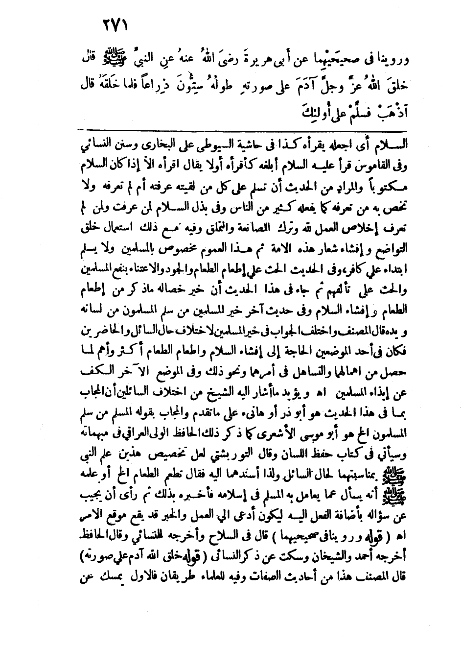 قوله: (وروينا في صحيحيهما) قال في السلاح وأخرجه النسائي وقال الحافظ: أخرجه أحمد والشيخان وسكت عن ذكر النسائي. قوله: (خلق الله آدم على صورته) قال المصنف: هذا من