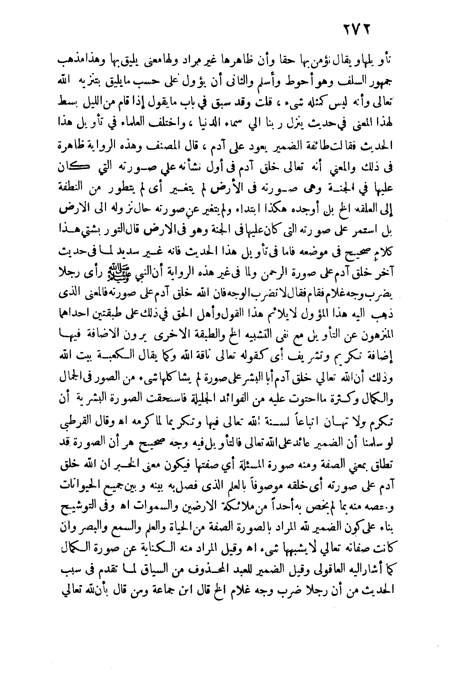 تأويلها ويقال: نؤمن بها حقًّا وأن ظاهرها غير مراد ولها معنى يليق بها وهذا مذهب جمهور السلف وهو أحوط وأسلم، والثاني: أن يؤول على حسب ما يليق بتنزيه الله تعالى وأنه ليس كمثله شيء، قلت وقد سبق في باب ما يقول إذا قام من الليل بسط لهذا المعنى في حديث ينزل ربنا إلى سماء الدنيا، واختلف العلماء في تأويل هذا الحديث فقالت طائفة الضمير: يعود على آدم، قال المصنف: وهذه الرواية ظاهرة في ذلك والمعنى أنه تعالى خلق آدم في أول نشأته على صورته التي كان عليها في الجنة وهي صورته في الأرض لم يتغير أي لم يتطور من النطفة إلى العلقة الخ، بل أوجده هكذا ابتداء ولم يتغير عن صورته حال نزوله إلى الأرض بل استمر على صورته التي كان عليها في الجنة وهو في الأرض، قال التوربشتي: هذا كلام صحيح في موضعه فأما في تأويل هذا الحديث فإنه غير سديد لما في حديث آخر خلق آدم على صورة الرحمن ولما في غير هذه الرواية أن النبي - صلى الله عليه وسلم - رأى رجلًا يضرب وجه غلام فقام فقال: "لا تضرب الوجه فإن الله خلق آدم على صورته" فالمعنى الذي ذهب إليه هذا المؤول لا يلائم هذا القول وأهل الحق في ذلك على طبقتين إحداهما المنزهون عن التأويل مع نفي التشبيه الخ والطبقة الأخرى يرون الإضافة فيها إضافة تكريم وتشريف أي كقوله تعالى: {نَاقَةَ اللَّهِ} وكما يقال: الكعبة بيت الله وذلك أن الله تعالى خلق آدم أبا البشر على صورة لم يشاكلها شيء من الصور في الجمال والكمال وكثرة ما احتوت عليه من الفوائد الجليلة فاستحقت الصورة البشرية أن تكرم ولا تهان اتباعًا لسنة الله تعالى فيها وتكريمًا لما كرمه اهـ. وقال القرطبي: لو سلمنا أن الضمير عائد على الله تعالى فالتأويل فيه وجه صحيح هو أن الصورة قد تطلق بمعنى الصفة ومنه صورة المسألة أي صفتها فيكون معنى الخبر إن الله خلق آدم على صورته أي خلقه موصوفًا بالعلم الذي فصل به بينه وبين جميع الحيوانات وخصه منه بما لم يخص به أحدًا من ملائكة الأرضين والسموات اهـ. وفي التوشيح بناء على كون الضمير الله المراد بالصورة الصفة من الحياة والعلم والسمع والبصر وإن كانت صفاته تعالى لا يشبهها شيء اهـ. وقيل المراد منه الكناية عن صورة الكمال كما أشار إليه العاقولي، وقيل: الضمير للعبد المحذوف من السياق لما تقدم في سبب الحديث من أن رجلًا ضرب وجه غلام الخ، قال ابن جماعة ومن قال بأن لله تعالى