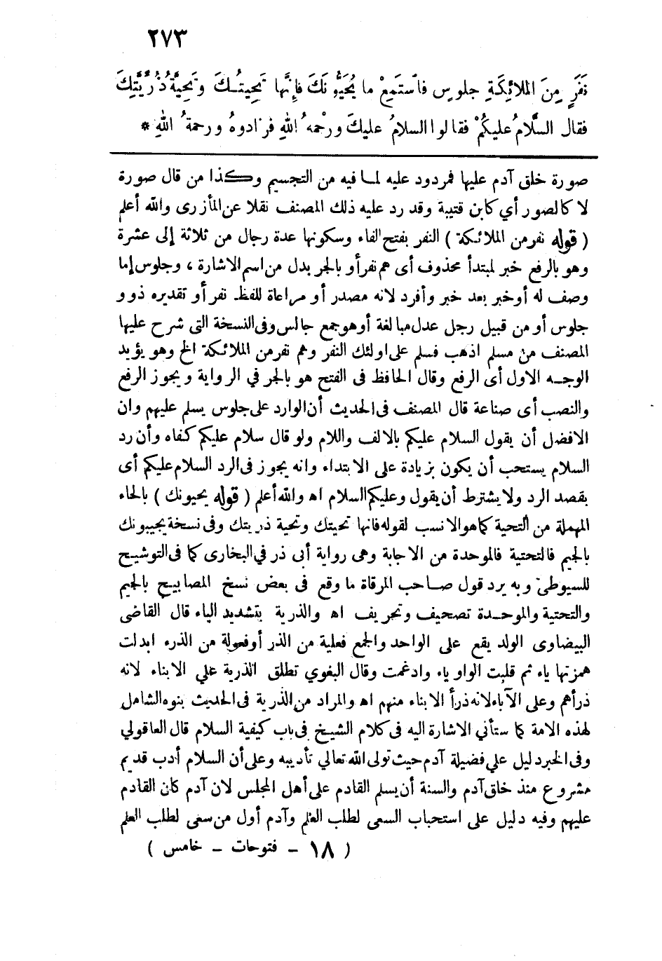 صورة خلق آدم عليها فمردود عليه لما فيه من التجسيم وكذا من قال: صورة لا كالصور أي كابن قتيبة وقد رد عليه ذلك المصنف نقلًا عن المأزري والله أعلم. قوله: (نفر من الملائكة) النفر بفتح الفاء وسكونها عدة رجال من ثلاثة إلى عشرة وهو بالرفع خبر لمبتدأ محذوف أي هم نفر أو بالجر بدل من اسم الإشارة، وجلوس إما وصف له أو خبر بعد خبر وأفرد لأنه مصدر أو مراعاة للفظ نفر أو تقديره ذوو جلوس أو من قبيل رجل عدل مبالغة أو هو جمع جالس وقد النسخة التي شرح عليها المصنف من مسلم اذهب فسلم على أولئك النفر وهم نفر من الملائكة الخ، وهو يؤيد الوجه الأول أي الرفع وقال الحافظ في الفتح هو بالجر في الرواية ويجوز الرفع والنصب أي صناعة قال المصنف في الحديث: إن الوارد على جلوس يسلم عليهم وإن الأفضل أن يقول: السلام عليكم