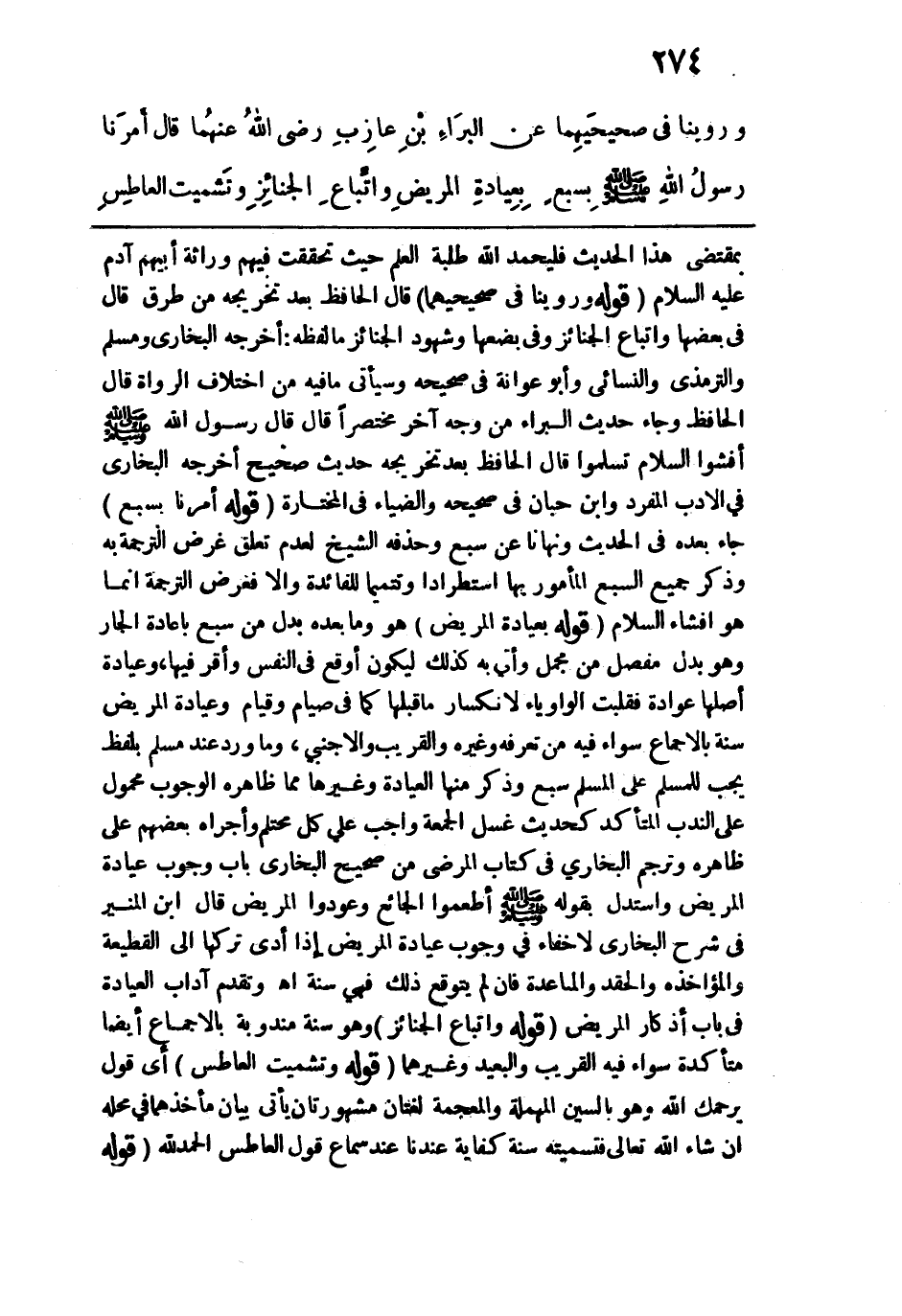 وروينا في "صحيحيهما" عن البراء بن عازب رضي الله عنهما قال: "أمرنا رسول الله - صلى الله عليه وسلم - بسبع: بعيادةِ المريض، واتِّباع الجنائز، وتشميتِ العاطس،