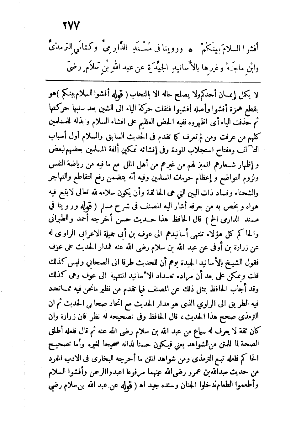لا يكمل إيمان أحدكم ولا يصلح حاله إلا بالتحاب. قوله: (أفشوا السلام بينكم) هو بقطع همزة أفشوا وأصله أفشيوا فنقلت حركة الياء إلى الشين بعد سلبها حركتها ثم حذفت الياء أي أظهروه ففيه الحض العظيم على إفشاء السلام وبذله للمسلمين كلهم من عرفت ومن لم تعرف كما تقدم في الحديث السابق والسلام أول أسباب التآلف ومفتاح استجلاب المودة وفي إفشائه تمكين ألفة المسلمين بعضهم لبعض وإظهار شعارهم المميز لهم من غيرهم من أهل الملل مع ما فيه من رياضة النفس ولزوم التواضع وإعظام حرمات المسلمين وفيه أنه يتضمن رفع التقاطع والتهاجر والشحناء وفساد ذات البين التي هي الحالقة وأن يكون سلامه الله تعالى لا يتبع فيه هواه ويخص به من يعرفه أشار إليه المصنف في شرح مسلم. قوله: (وروينا في مسند الدارمي الخ) قال الحافظ: هذا حديث حسن أخرجه أحمد والطبراني والحاكم كل هؤلاء تنتهي أسانيدهم إلى عوف بن أبي جميلة الأعرابي الراوي له عن زرارة بن أوجه عن عبد الله بن سلام رضي الله عنه فمدار الحديث على عوف فقول الشيخ بالأسانيد الجيدة يوهم أن للحديث طرقًا إلى الصحابي وليس كذلك قلت ويمكن على بعد أن مراده تعداد الأسانيد المنتهية إلى عوف وهي كذلك وقد أجاب الحافظ بمثل ذلك عن المصنف فيما تقدم من نظير ما نحن فيه مما تعدد فيه الطريق إلى الراوي الذي هو مدار الحديث مع اتحاد صحابي الحديث ثم إن الترمذي صحح هذا الحديث، قال الحافظ وفي تصحيحه له نظر فإن زرارة وإن كان ثقة لا يعرف له سماع من عبد الله بن سلام رضي الله عنه ثم قال فلعله أطلق الصحة لما للمتن من الشواهد يعني فيكون حسنًا لذاته صحيحًا لغيره وأما تصحيح الحاكم فلعله تبع الترمذي ومن شواهد المتن ما أخرجه البخاري في الأدب المفرد من حديث عبد الله بن عمرو رضي الله عنهما مرفوعًا اعبدوا الرحمن وأفشوا السلام وأطعموا الطعام تدخلوا الجنان وسنده جيد اهـ. قوله: (عن عبد الله بن سلام رضي