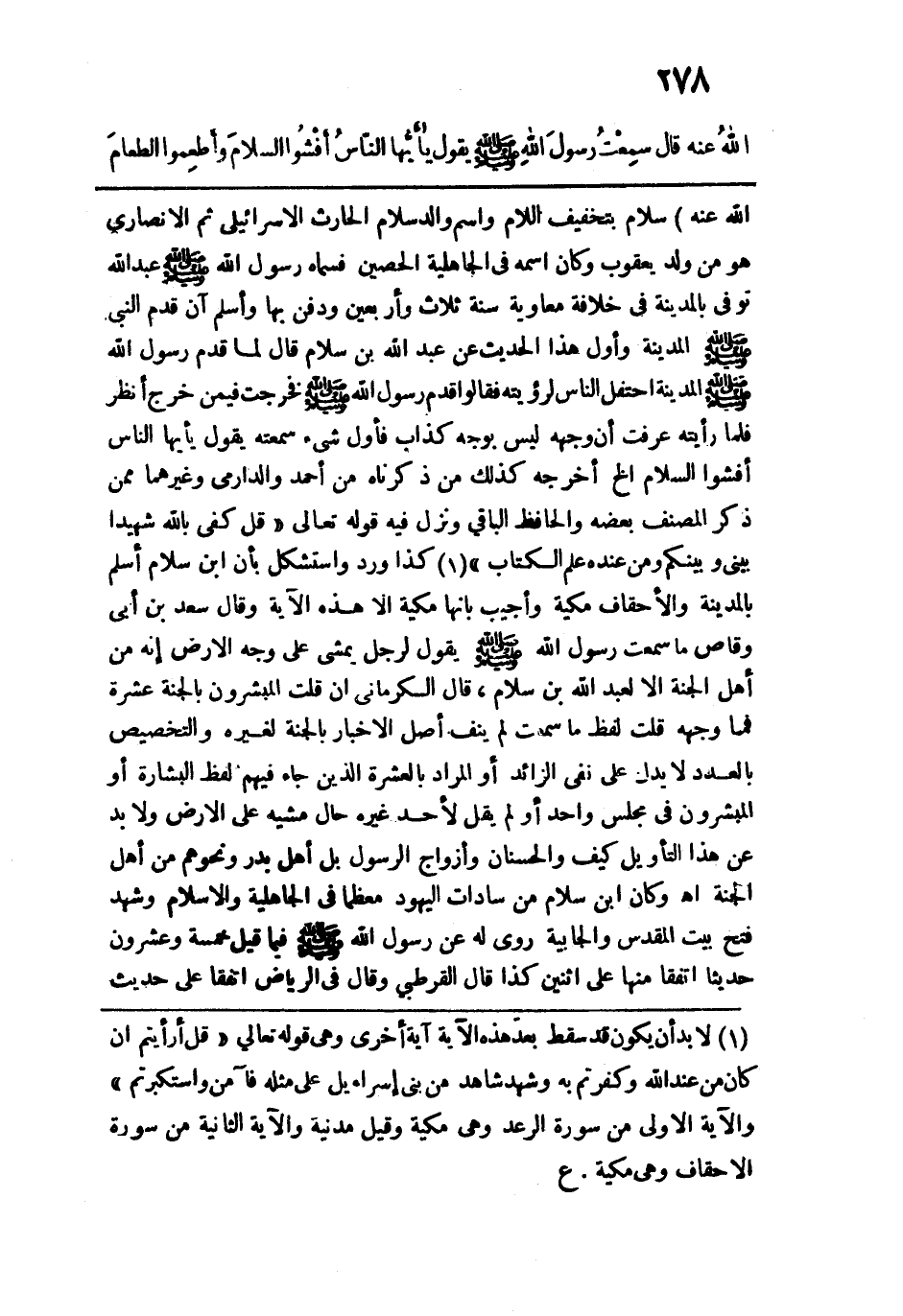 والد سلام الحارث الإسرائيلي ثم الأنصاري هو من ولد يعقوب وكان اسمه في الجاهلية الحصن فسماه رسول الله - صلى الله عليه وسلم - عبد الله توفي بالمدينة في خلافة معاوية سنة ثلاث وأربعين ودفن بها وأسلم أن قدم النبي - صلى الله عليه وسلم - المدينة وأول هذا الحديث عن عبد الله بن سلام قال لما قدم رسول الله - صلى الله عليه وسلم - المدينة احتفل النّاس لرؤيته فقالوا: قدم رسول الله - صلى الله عليه وسلم - فخرجت فيمن خرج انظر فلما رأيته عرفت أن وجهه ليس بوجه كذاب فأول شيء سمعته يقول: "يا أيها النّاس أفشوا السلام الخ" أخرجه كذلك من ذكرناه من أحمد والدارمي وغيرهما ممن ذكر المصنف بعضه والحافظ الباقي ونزل فيه قوله تعالى: {كَفَى بِاللَّهِ شَهِيدًا بَيْنِي وَبَيْنَكُمْ وَمَنْ عِنْدَهُ عِلْمُ الْكِتَابِ} كذا ورد واستشكل بأن ابن سلام أسلم بالمدينة والأحقاف مكية وأجيب بأنها مكية إلا هذه الآية وقال سعد بن أبي وقاص: ما سمعت رسول الله - صلى الله عليه وسلم - يقول لرجل يمشي على وجه الأرض إنه من أهل الجنة إلا لعبد الله بن سلام، قال الكرماني إن قلت المبشرون بالجنة عشرة فما وجهه قلت: لفظ ما سمعت لم ينف أصل الإخبار بالجنة لغيره والتخصيص بالعدد لا يدل على نفي الزائد أو المراد بالعشرة الذين جاء فيهم لفظ البشارة أو المبشرون في مجلس واحد أو لم يقل لأحد غيره حال مشيه على الأرض ولا بد عن هذا التأويل كيف والحسنان وأزواج الرسول بل أهل بدر ونحوهم من أهل الجنة اهـ، وكان ابن سلام من سادات اليهود معظمًا في الجاهلية والإسلام وشهد فتح بيت المقدس والجابية روي له عن رسول الله - صلى الله عليه وسلم - فيما قيل: خمسة وعشرون حديثًا اتفقا منها على اثنين كذا قال القرطبي وقال في الرياض اتفقا على حديث