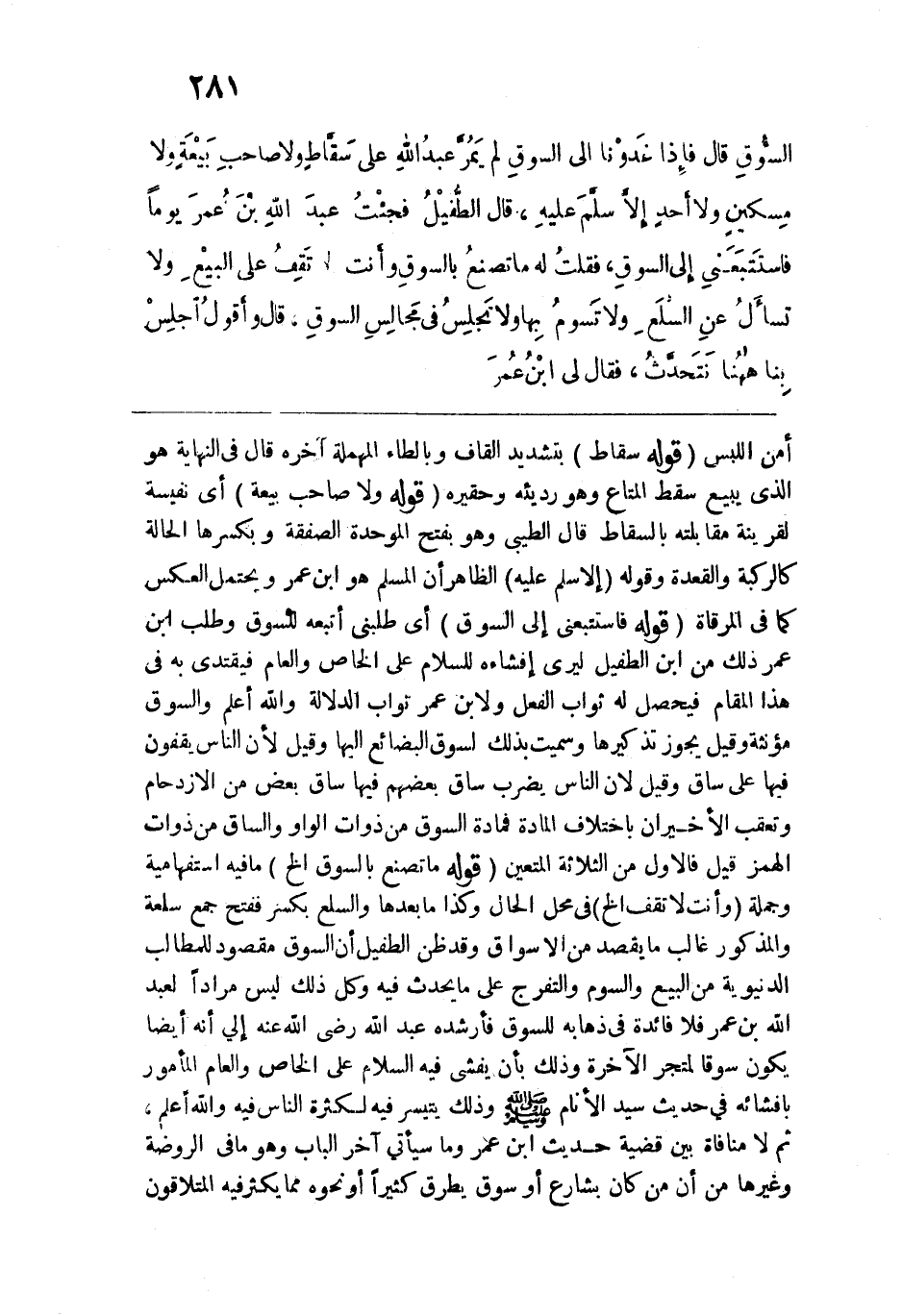 للسلام على الخاص والعام فيقتدي به في هذا المقام فيحصل له ثواب الفعل ولابن عمر ثواب الدلالة والله أعلم. والسوق مؤنثة وقيل: يجوز تذكيرها وسميت بذلك لسوق البضائع إليها وقيل: لأن النّاس يقفون فيها على ساق وقيل لأن النّاس يضرب ساق بعضهم فيها ساق بعض من الازدحام وتعقب الأخيران باختلاف المادة فمادة السوق من ذوات الواو والساق من ذوات الهمز قيل: فالأول من الثلاثة المتعين. قوله: (ما تصنع بالسوق الخ) ما فيه استفهامية وجملة (وأنت لا تقف الخ) في محل الحال وكذا ما بعدها والسلع بكسر ففتح جمع سلعة والمذكور غالب ما يقصد من الأسواق وقد ظن الطفيل أن السوق مقصود للمطالب الدنيوية من البيع والسوم والتفرج على ما يحدث فيه وكل ذلك ليس مرادًا لعبد الله بن عمر فلا فائدة في ذهابه للسوق فأرشده عبد الله رضي الله عنه إلى أنه أيضًا يكون سوقًا لمتجر الآخرة وذلك بأن يفشي فيه السلام على الخاص والعام المأمور بإفشائه في حديث سيد الأنام - صلى الله عليه وسلم - وذلك يتيسر فيه لكثرة النّاس فيه والله أعلم، ثم لا منافاة بين قضية حديث ابن عمر وما سيأتي آخر الباب وهو ما في الروضة وغيرها من أن من كان بشارع أو سوق يطرق كثيرًا أو نحوه مما يكثر فيه المتلاقون