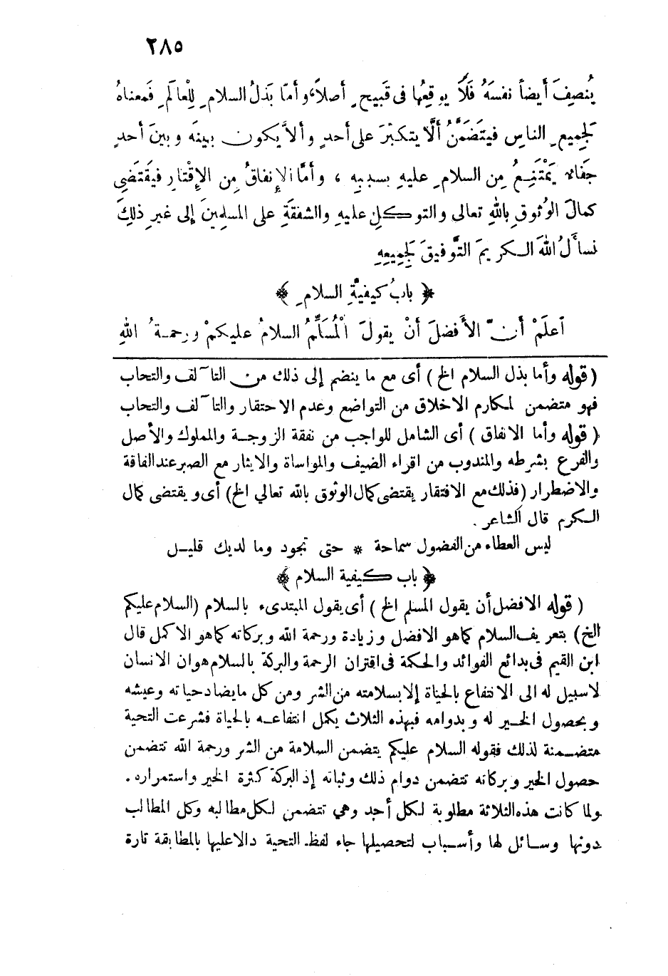 قوله: (وأما بذل السلام الخ) أي مع ما ينضم إلى ذلك من التآلف والتحاب فهو متضمن لمكارم الأخلاق من التواضع وعدم الاحتقار والتآلف والتحاب. قوله: (وأما الإنفاق) أي الشامل للواجب من نفقة الزوجة والمملوك والأصل والفرع بشرطه والمندوب من إقراء الضيف والمواساة والإيثار مع الصبر عند الفاقة والاضطرار (فذلك مع الافتقار يقتضي كمال الوثوق بالله تعالى الخ) أي ويقتضي كمال الكرم قال الشاعر:
