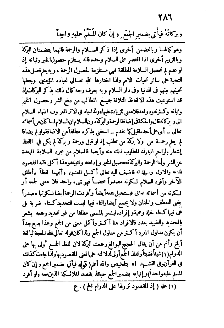 وهو كمالها وبالتضمن أخرى إذا ذكر السلام والرحمة فإنهما يتضمنان البركة وباللزوم أخرى إذا اقتصر على السلام وحده فإنه يستلزم حصول الخير وثباته إذ لو عدم لم تحصل السلامة المطلقة فهي مستلزمة لحصول الرحمة، وبه يعلم فضل هذه التحية على سائر تحيات الأمم ولذا اختارها الله تعالى لعباده المؤمنين وجعلها تحيتهم بينهم في الدنيا وفي دار السلام وبه يعرف وجه كمال ذلك بذكر البركات إذ قد استوعبت هذه الألفاظ الثلاثة جميع المطالب من دفع الشر وحصول الخير وثباته وكثرته ودوامه فلا معنى للزيادة عليها، لذا جاء في الأثر المعروف انتهاء السلام إلى وبركاته قال والحكمة في إضافة الرحمة والبركة دون السلام أن السلام لما كان من أسمائه تعالى -أي على أحد ما قيل كما تقدم- استغنى بذكره مطلقًا عن الإضافة ولو لم يضافا لم يعلم رحمة من ولا بركة من تطلب إذ لو قيل ورحمة وبركة لم يكن في اللفظ إشعار بالراحم المبارك المطلوب ذلك منه وأيضًا فالسلام من مجرد السلامة المبعدة عن الشر وأما الرحمة والبركة فتحصيل الخير وإدامته وتثبيته وهذا أكمل فإنه المقصود لذاته والأول وسيلة له فأضيف إليه تعالى أكمل المعنيين وأتمهما لفظًا وأطلق الآخر وأفرد السلام لكونه مصدرًا محضًا فهو شيء واحد فلا معنى لجمعه أو لكونه من أسمائه تعالى فيستحيل جمعه أيضًا وأفردت الرحمة أيضًا لكونها مصدرًا بمعنى التعطف والحنان ولا يجمع أيضًا والتاء فيها ليست للتحديد كتاء ضربة بل هي فيها كتاء خلة ومحبة وإفراده ليشعر بالمسمى مطلقًا من غير تحديد وجمعه يشر بالتحديد والتقييد بعود فالإفراد هنا أكثر وأكمل معنى من الجمع وهذا بديع جدًّا أن يكون مدلول المفرد أكثر من مدلول الجمع ولذا كان قوله تعالى {فَلِلَّهِ الْحُجَّةُ الْبَالِغَةُ} أبلغ وأتم من أن يقال الحجج البوالغ وجمعت البركة لأن لفظ الجمع أولى بها على الدوام شيئًا فشيئا ولفظ الجمع أولى لدلالته على المعنى المقصود بها ولذا جاءت كذلك في القرآن وفي التشهد اهـ، بتلخيص والله أعلم. قوله: (فيأتي بضمير الجمع وإن كان المسلم عليه واحدًا) وإتيانه بضمير الجمع حينئذٍ بقصد الملائكة الذين معه ولو أفرد