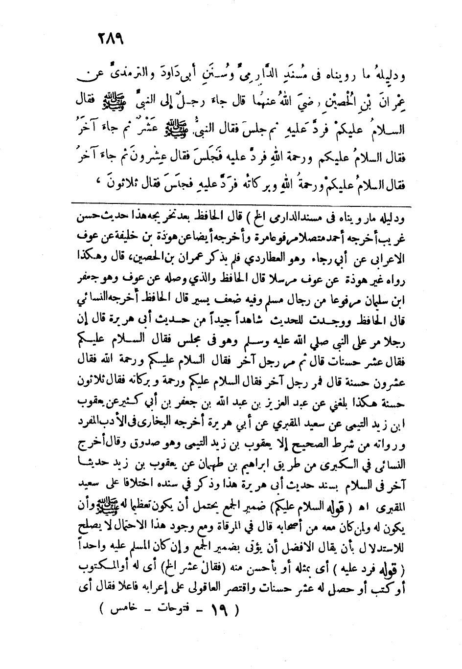 (ودليله ما رويناه في مسند الدارمي الخ) قال الحافظ بعد تخريجه: هذا حديث حسن غريب أخرجه أحمد متصلًا مرفوعًا عمرة وأخرجه أيضًا عن هوذة بن خليفة عن عوف الأعرابي عن أبي رجاء وهو العطاردي فلم يذكر غمران بن الحصن، قال وهكذا رواه غير هوذة عن عوف مرسلًا قال الحافظ: والذي وصله عن عوف وهو جعفر بن سليمان مرفوعًا من رجال مسلم وفيه ضعف يسير، قال الحافظ: أخرجه النسائي، قال الحافظ: ووجدت للحديث شاهدًا جيدًا من حديث أبي هريرة قال: إن رجلًا مر على النبي - صلى الله عليه وسلم - وهو في مجلس فقال: السلام عليكم فقال: "عشر حسنات" قال ثم مر رجل آخر فقال: السلام عليكم ورحمة الله فقال: "عشرون حسنة" قال فمر رجل آخر فقال: السلام عليكم ورحمته وبركاته فقال: "ثلاثون حسنة" هكذا بلغني عن عبد العزيز بن عبد الله بن جعفر بن أبي كثير عن يعقوب بن زيد التيمي عن سعيد المقبري عن أبي هريرة أخرجه البخاري في الأدب المفرد ورواته من شرط الصحيح إلا يعقوب بن قلد التيمي وهو صدوق وقال: أخرج النسائي في الكبرى من طريق إبراهيم بن طهمان عن يعقوب بن زيد حديثًا آخر في السلام بسند حديث أبي هريرة هذا وذكر في سنده اختلافًا على سعيد المقبري اهـ. قوله: (السلام عليكم) ضمير الجمع يحتمل أن يكون تعظيمًا له - صلى الله عليه وسلم - وأن يكون له ولمن كان معه من أصحابه قال في المرقاة ومع وجود هذا الاحتمال لا يصلح للاستدلال بأن يقال: الأفضل أن يؤتى بضمير الجمع وإن كان المسلم عليه واحدًا. قوله: (فرد عليه) أي بمثله أو بأحسن منه (فقال عشر الخ) أي له أو المكتوب أو كتب أو حصل له عشر حسنات واقتصر العاقولي على إعرابه فاعلًا فقال: أي