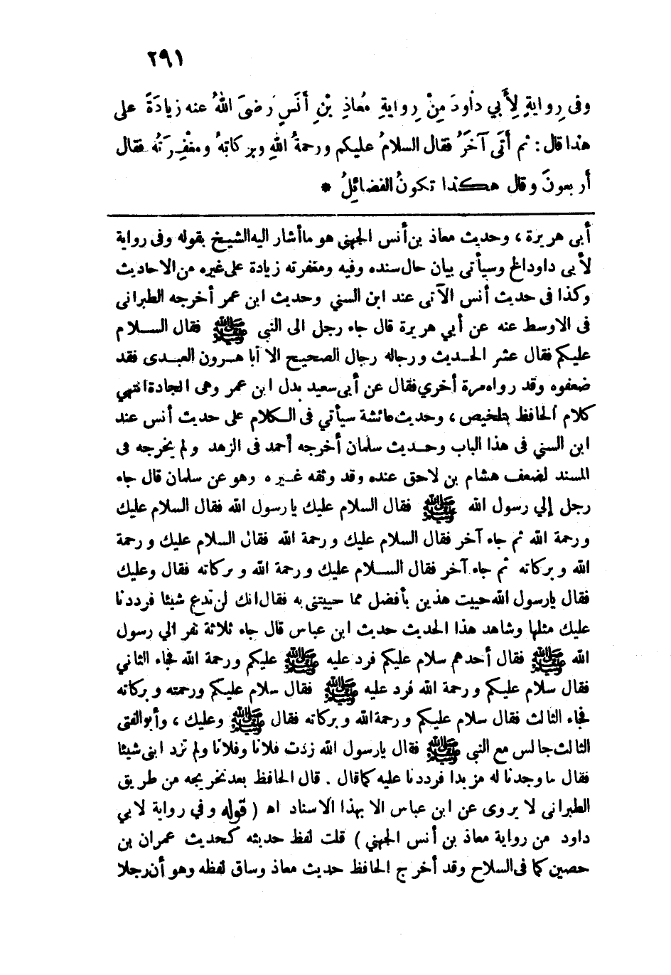 وفي رواية لأبي داود من رواية معاذ بن أنس رضي الله عنه زيادة على هذا، قال: "ثم أتى آخر فقال: السلام عليكم ورحمة الله وبركاته ومغفرته، فقال: أربعون، وقال: هَكَذا تَكُونُ الفَضَائِلُ".