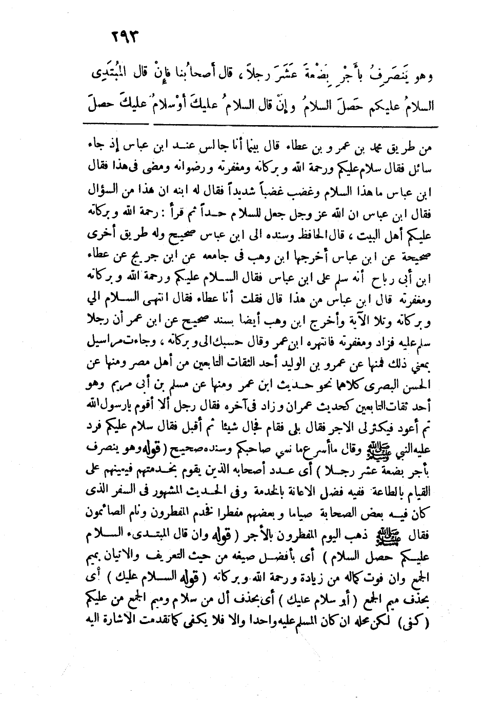 من طريق محمد بن عمرو بن عطاء قال: بينما أنا جالس عند ابن عباس إذ جاء سائل فقال: سلام عليكم ورحمة الله وبركاته ومغفرته ورضوانه ومضى في هذا، فقال ابن عباس: ما هذا السلام وغضب غضبًا شديدًا فقال له ابنه: إن هذا من السؤال، فقال ابن عباس: إن الله عزَّ وجلَّ جعل للسلام حدًّا ثم قرأ: رحمة الله وبركاته عليكم أهل البيت، قال الحافظ وسنده إلى ابن عباس صحيح وله طريق أخرى صحيحة عن ابن عباس أخرجها ابن وهب في جامعه عن ابن جريج عن عطاء بن أبي رباح أنه سلم على ابن عباس فقال: السلام عليكم ورحمة الله وبركاته ومغفرته، قال ابن عباس: من هذا؟ قال: فقلت: أنا عطاء، فقال: انتهى السلام إلى وبركاته وتلا الآية وأخرج ابن وهب أيضًا بسند صحيح عن ابن عمر أن رجلًا سلم عليه فزاد ومغفرته فانتهره ابن عمر وقال: حسبك إلى وبركاته، وجاءت مراسيل بمعنى ذلك فمنها عن عمرو بن الوليد أحد الثقات التابعين من أهل مصر ومنها عن الحسن البصري كلاهما نحو حديث ابن عمر ومنها عن مسلم بن أبي مريم وهو أحد ثقات التابعين كحديث عمران وزاد في آخره فقال رجل: ألا أقوم يا رسول الله ثم أعود فيكثر لي الأجر؟ فقال: "بلى" فقام فجال شيئًا ثم أقبل فقال: سلام عليكم فرد عليه النبي - صلى الله عليه وسلم - وقال: "ما أسرع ما نسي صاحبكم" وسنده صحيح. قوله: (وهو ينصرف بأجر بضعة عشر رجلًا) أي عدد أصحابه الذين يقوم بخدمتهم فيعينهم على القيام بالطاعة ففيه فضل الإعانة بالخدمة وقد الحديث