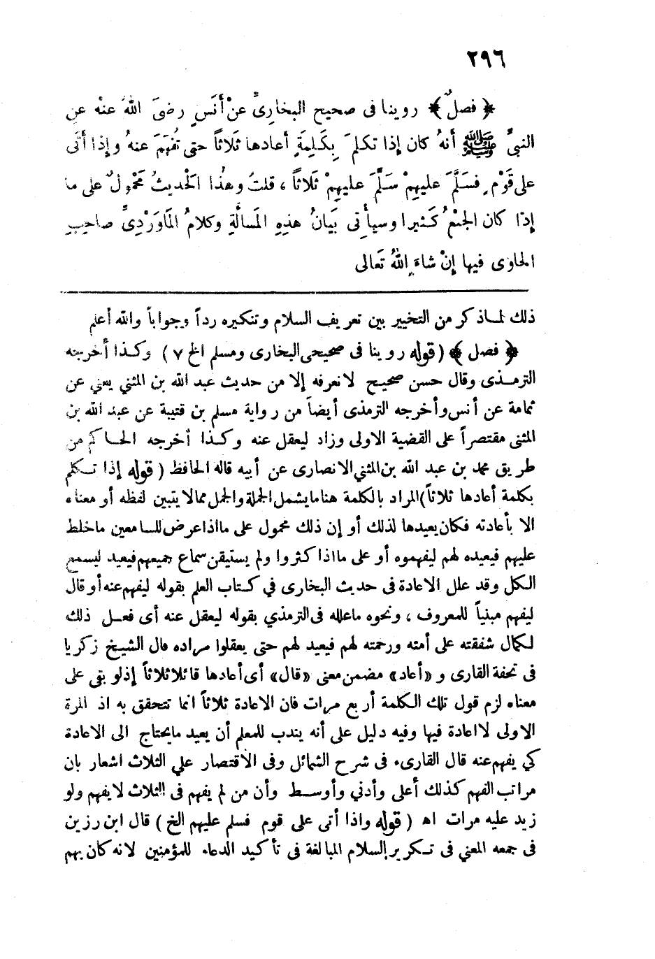 فصل: روينا في "صحيح البخاري" عن أنس رضي الله عنه عن النبي - صلى الله عليه وسلم -: "أنه كان إذا تكلم بكلمة أعادها ثلاثًا حتى تُفهم عنه، وإذا أتى على قوم فسلَّم عليهم سلَّم عليهم ثلاثًا".