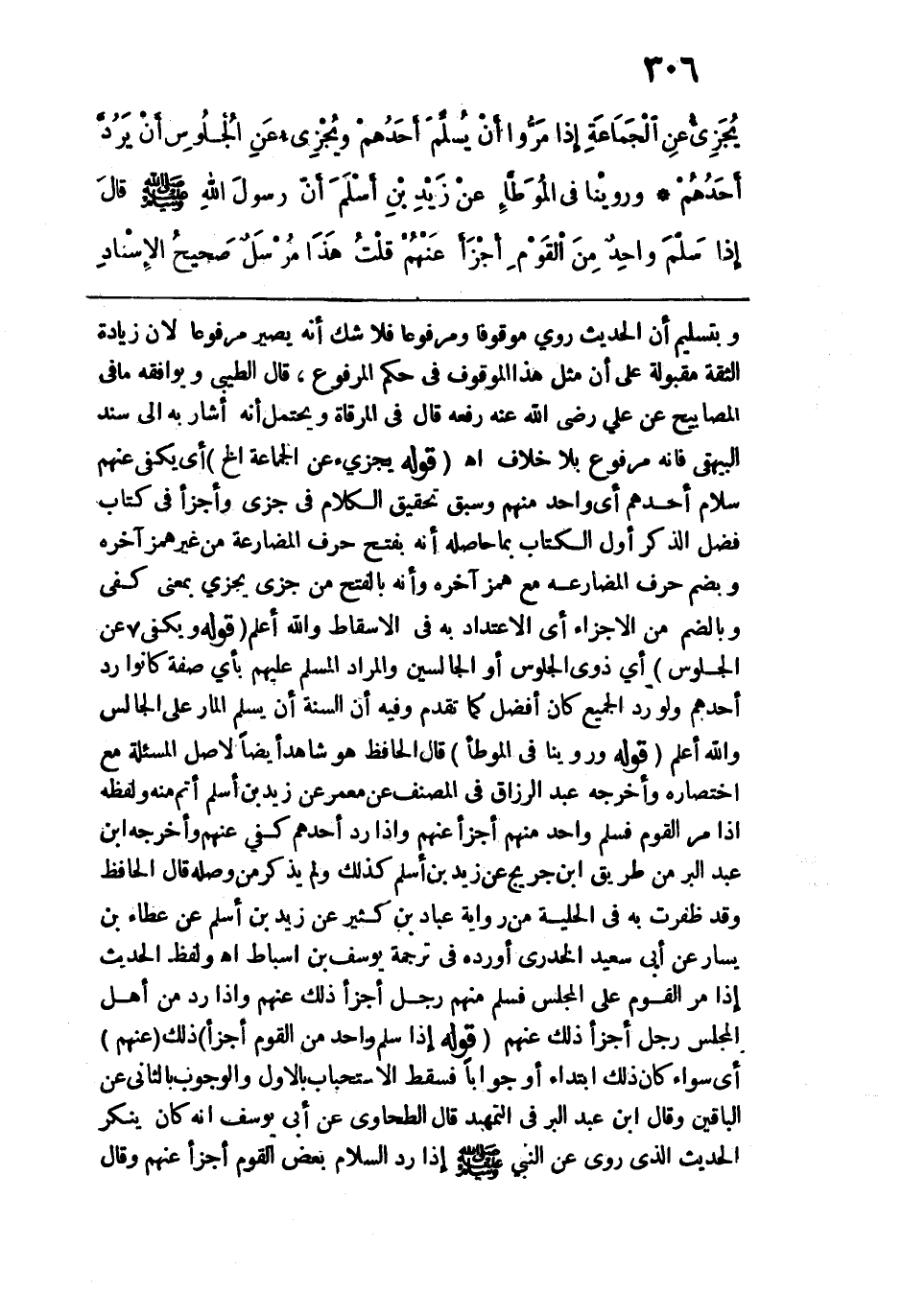 وروينا في الموطأ عن زيد بن أسلم أن رسول الله -صلى الله عليه وسلم- قال: "إذا سَلَّمَ وَاحِدٌ مِنَ القَوْم أجْزأ عَنْهمْ" قلت: هذا مرسل صحيح الإسناد.
