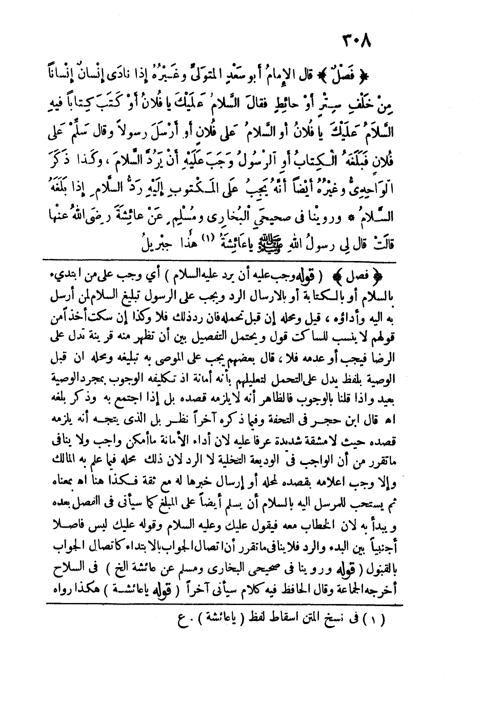 قوله: (وجب عليه أن يرد عليه السلام) أي وجب على من ابتدئ السلام أو بالكتابة أو بالإرسال الرد ويجب على الرسول تبليغ السلام لمن أرسل به إليه وأداؤه، قيل: ومحله إن قبل تحمله فإن رد ذلك فلا وكذا إن سكت أخذاً من قولهم لا ينسب للساكت قول ويحتمل التفصيل بين أن تظهر منه قرينة تدل على الرضا فيجب أو عدمه فلا، قال بعضهم: يجب على الموصى به تبليغه ومحله إن قبل الوصية بلفظ يدل على التحمل لتعليلهم بأنه أمانة إذ تكليفه الوجوب بمجرد الوصية بعيد وإذا قلنا بالوجوب فالظاهر أنه لا يلزمه قصده بل إذا اجتمع به وذكر بلغه اهـ. قال ابن حجر في التحفة وفيما ذكره آخراً نظر بل الذي يتجه أنه يلزمه قصده حيث لا مشقة شديدة عرفاً عليه لأن أداء الأمانة ما أمكن واجب ولا ينافي ما تقرر من أن الواجب في الوديعة التخلية لا الرد لأن ذلك محله فيما علم به المالك وإلا وجب إعلامه بقصده لمحله أو إرسال خبرها له مع ثقة فكذا هنا اهـ. بمعناه ثم يستحب للمرسل إليه بالسلام أن يسلم أيضاً على المبلغ كما سيأتي في الفصل بعده ويبدأ به لأن الخطاب معه فيقول: عليك وعليه السلام وقوله: عليك ليس فاصلاً أجنبياً بين البدء والرد فلا ينافي ما تقرر أن اتصال الجواب بالابتداء كاتصال الجواب بالقبول. قوله: (وروينا في صحيحي البخاري ومسلم عن عائشة