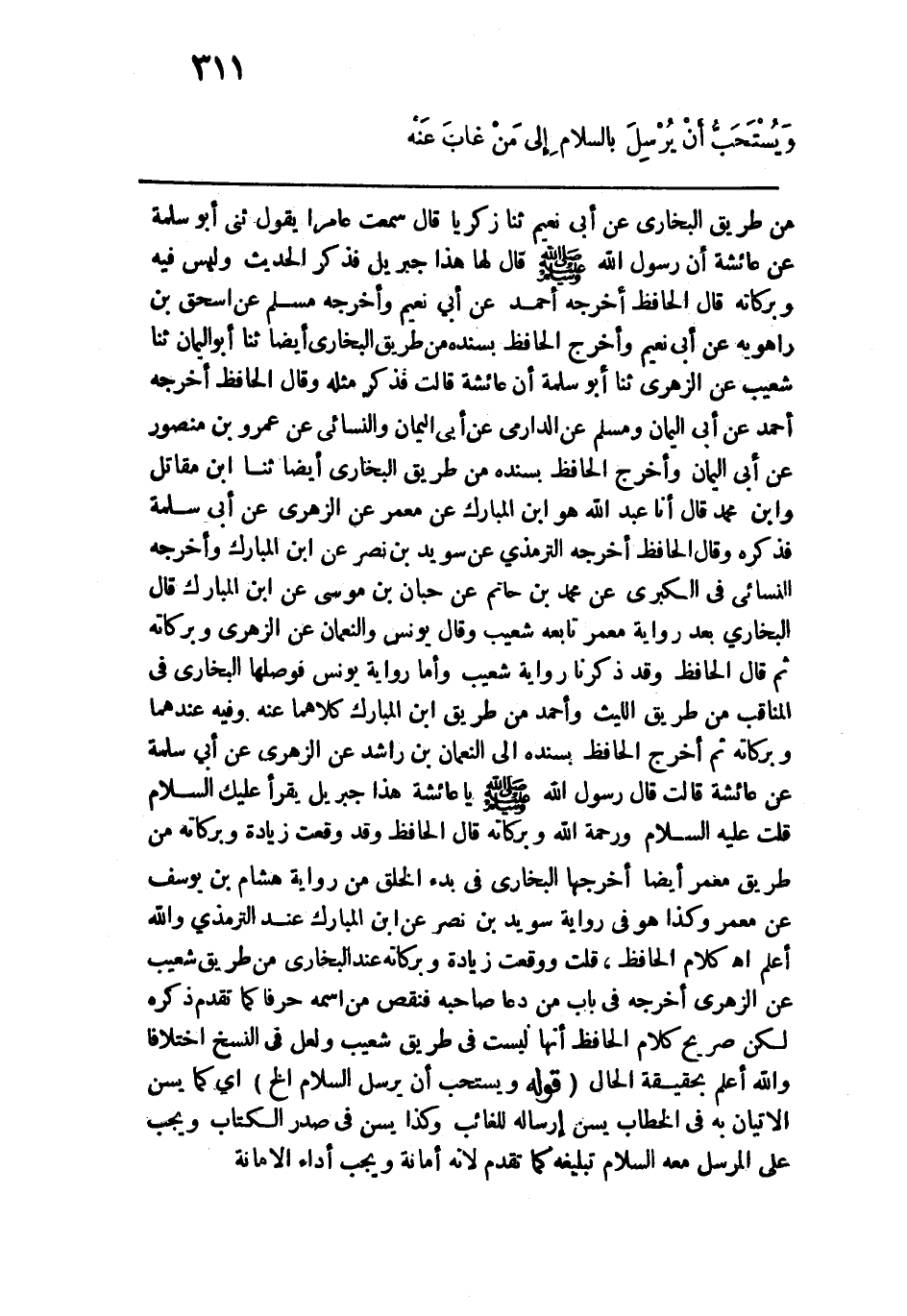 من طريق البخاري عن أبي نعيم حدثنا زكريا قال: سمعت عامراً يقول: حدثني أبو سلمة عن عائشة أن رسول الله -صلى الله عليه وسلم- قال لها: "هذا جبريل" فذكر الحديث وليس فيه وبركاته قال الحافظ أخرجه أحمد عن أبي نعيم وأخرجه مسلم عن إسحاق بن راهويه عن أبي نعيم وأخرج الحافظ بسنده من طريق البخاري أيضاً حدثنا أبو اليمان حدثنا شعيب عن الزهري حدثنا أبو سلمة أن عائشة قالت: فذكر مثله وقال الحافظ: أخرجه أحمد عن أبي اليمان ومسلم عن الدارمي عن أبي اليمان والنسائي عن عمرو بن منصور عن أبي اليمان وأخرج الحافظ بسنده من طريق البخاري أيضاً حدثنا ابن مقاتل وابن محمد قال: أخبرنا عبد الله هو ابن المبارك عن معمر عن الزهري عن أبي سلمة فذكره وقال الحافظ: أخرجه الترمذي عن سويد بن نصر عن ابن المبارك وأخرجه النسائي في الكبرى عن محمد بن حاتم عن حبان بن موسى عن ابن المبارك قال البخاري بعد رواية معمر تابعه شعيب وقال يونس والنعمان عن الزهري وبركاته ثم قال الحافظ: وقد ذكرنا رواية شعيب وأما رواية يونس فوصلها البخاري في المناقب من طريق الليث وأحمد من طريق ابن المبارك كلاهما عنه وفيه عندهما وبركاته ثم أخرج الحافظ بسنده إلى النعمان بن راشد عن الزهري عن أبي سلمة عن عائشة قالت: قال رسول الله -صلى الله عليه وسلم-: "يا عائشة هذا جبريل يقرأ عليك السلام" قلت: عليه السلام ورحمة الله وبركاته، قال الحافظ: وقد وقعت زيادة وبركاته من طريق معمر أيضاً أخرجها البخاري في بدء الخلق من رواية هشام بن يوسف عن معمر وكذا هو في رواية سويد بن نصر عن ابن المبارك عند الترمذي والله أعلم اهـ. كلام الحافظ، قلت: ووقعت زيادة وبركاته عند البخاري من طريق شعيب عن الزهري أخرجه في باب من دعا صاحبه فنقص من اسمه حرفاً كما تقدم ذكره لكن صريح كلام الحافظ أنها ليست في طريق شعيب ولعل في النسخ اختلافاً والله أعلم بحقيقة الحال. قوله: (ويستحب أن يرسل السلام الخ) أي كما يسن الإتيان به في الخطاب يسن إرساله للغائب وكذا يسن في صدر الكتاب ويجب على المرسل معه السلام تبليغه كما تقدم لأنه أمانة ويجب أداء الأمانة.
