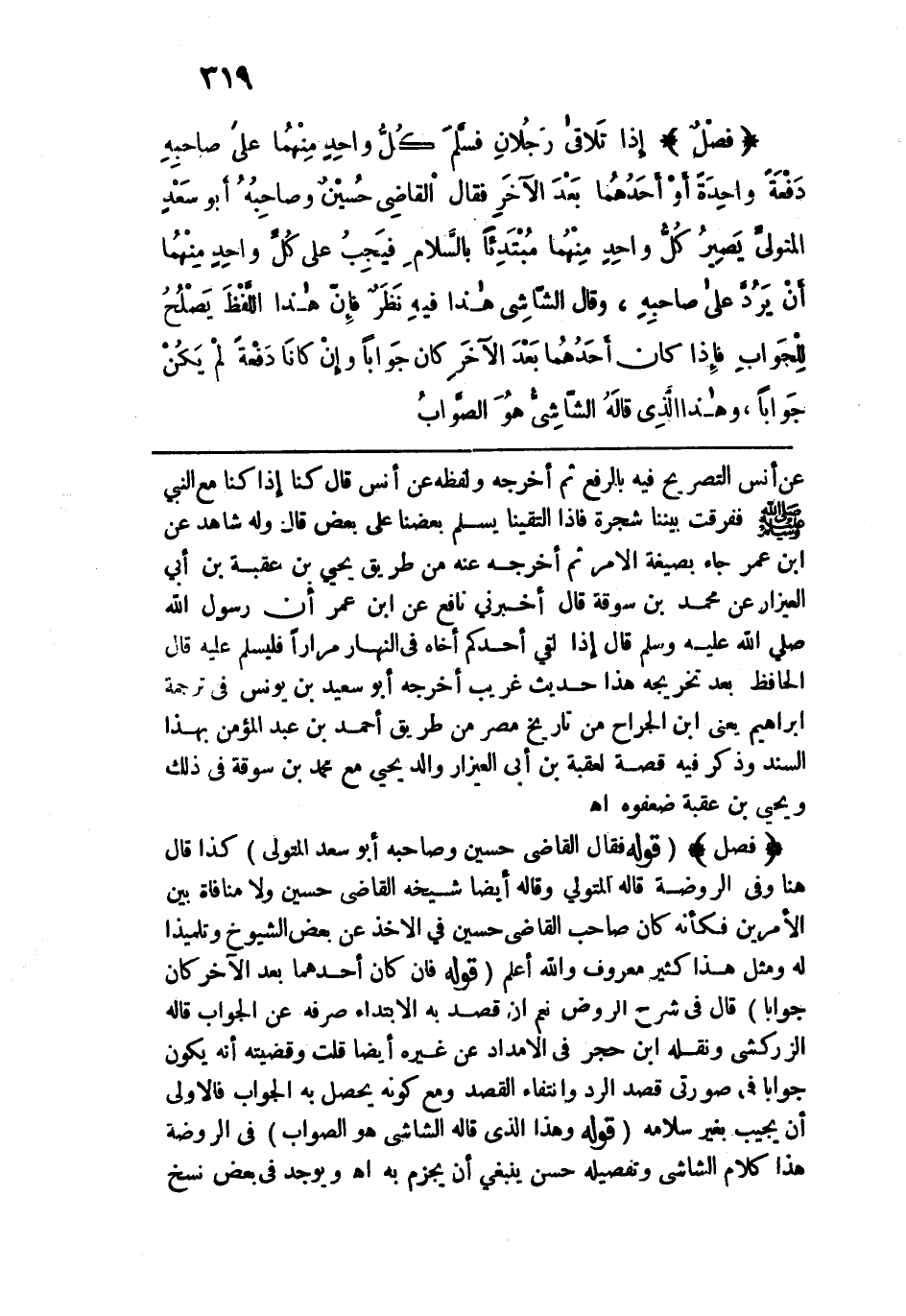 وقاله أيضاً شيخه القاضي حسين ولا منافاة بين الأمرين فكأنه كان صاحب القاضي حسين في الأخذ عن بعض الشيوخ وتلميذاً له ومثل هذا كثير معروف والله أعلم. قوله: (فإن كان أحدهما بعد الآخر كان جواباً) قال في شرح الروض: نعم إن قصد به الابتداء صرفه عن الجواب قاله الزركشي ونقله ابن حجر في الإمداد عن غيره أيضاً قلت وقضيته أنه يكون جواباً في صورتي قصد الرد وانتفاء القصد ومع كونه يحصل به الجواب فالأولى أن يجيب بغير سلامه. قوله: (وهذا الذي قاله الشاشي هو الصواب) في الروضة هذا كلام الشاشي وتفصيله حسن ينبغي أن يجزم به اهـ. ويوجد في بعض نسخ