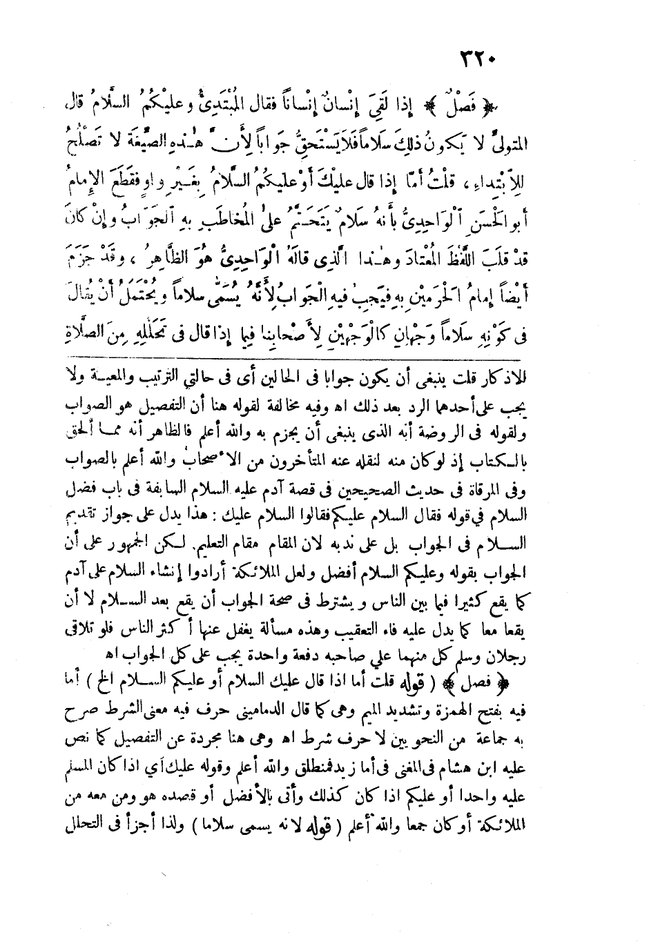 قلت: أما إذا قال: عليك، أو عليكم السلام، بغير واو، فقطع الإِمام أبو الحسن الواحدي بأنه سلام يتحتم على المخاطَب به الجواب، وإن كان قد قلب اللفظ المعتاد، وهذا الذي قاله الواحدي هو الظاهر. وقد جزم أيضاً إمام الحرمين به، فيجب فيه الجواب لأنه يسمى سلاماً، ويحتمل أن يقال: في كونه سلاماً وجهان كالوجهين لأصحابنا فيما إذا قال في تحلله