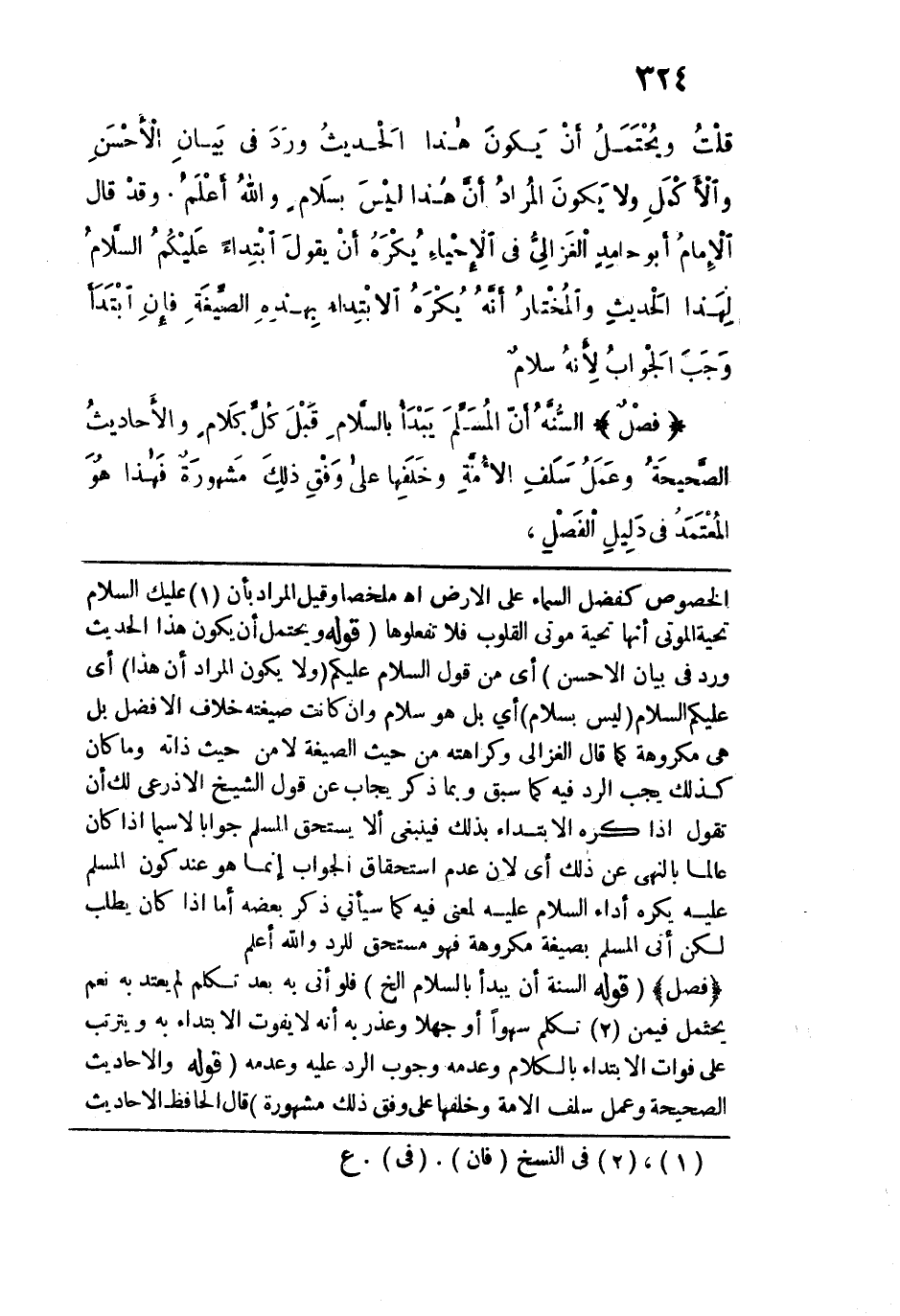 فصل: السُّنَّة أن المسلِّم يبدأ بالسلام قبل كل كلام، والأحاديث الصحيحة وعمل سلف الأمة وخلفها على وفق ذلك مشهورة، فهذا هو المعتمد في دليل الفصل.